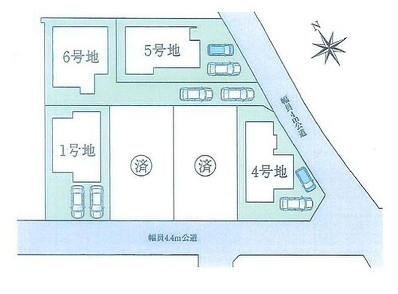| 駐車場 | 2台 | 道路の幅員 | 道路幅:4m・4.4m、アスファルト舗装、南側4.4m公道、東側4m公道 |