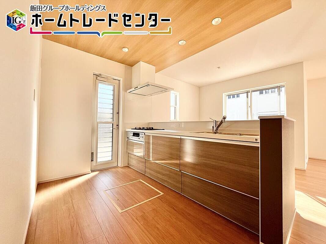 正面に壁がないため作業台からの景色があり、開放感があります。小さなお子様がいるご家庭では、お子様から目を離すことなく安心して料理することができます。