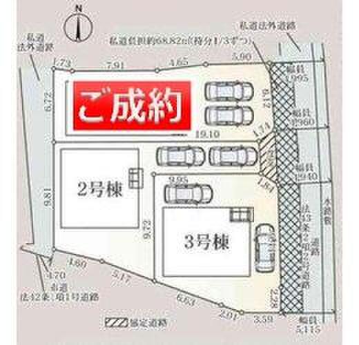 | 駐車場 | 2台 | 道路の幅員 | 道路幅:4.9m、アスファルト舗装、東側約4.9m私道法外通路、協定道路あり |