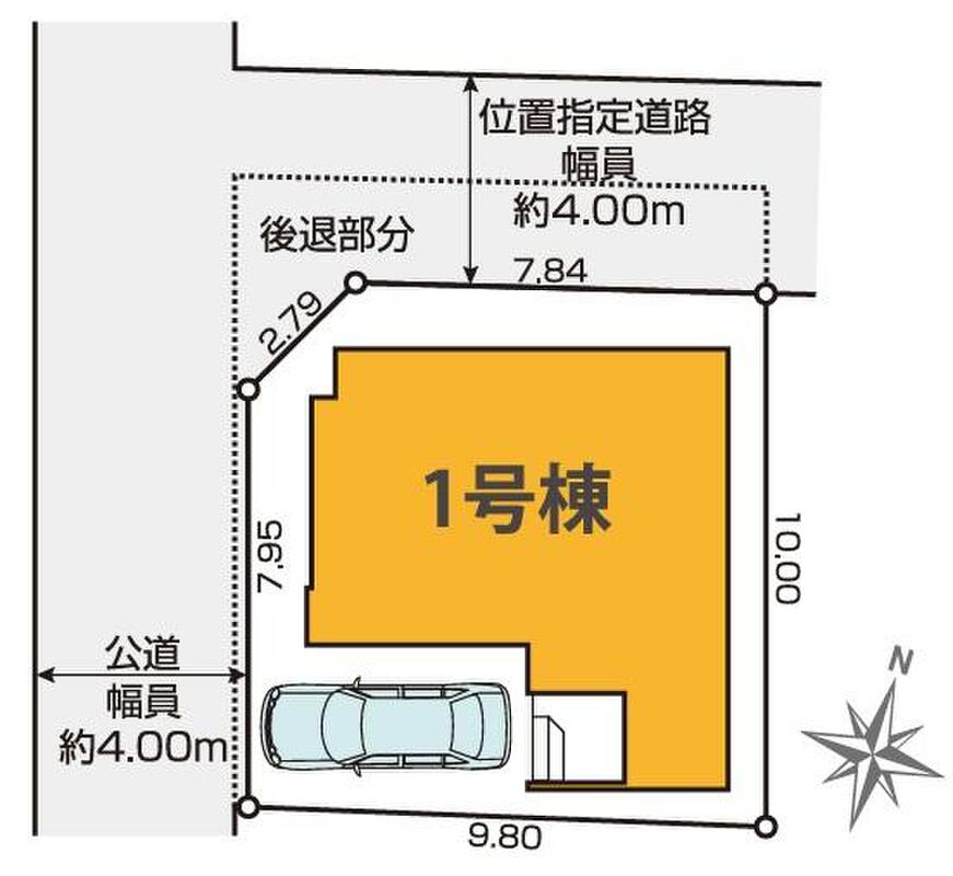 | 駐車場 | 1台 | 道路の幅員 | 道路幅:4m、アスファルト舗装、北側約4.0m位置指定道路、西側約4.0m公道 |