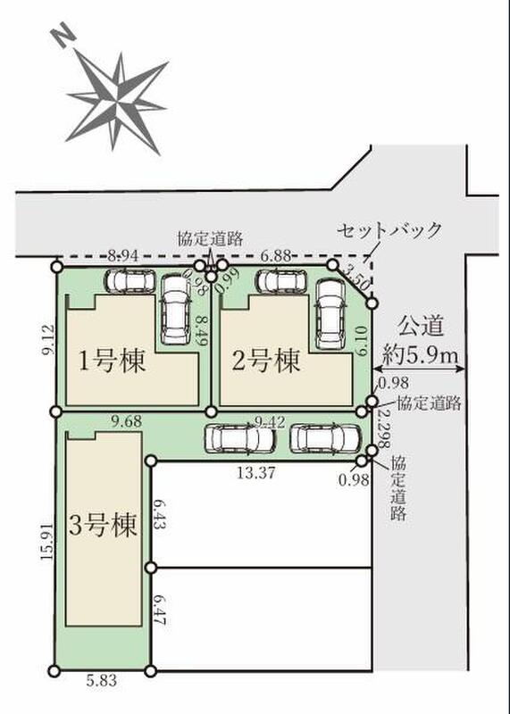 | 駐車場 | 2台 | 道路の幅員 | 道路幅:4m・5.9m、アスファルト舗装、北東側約4.0m公道、南東側約5.9m公道 |