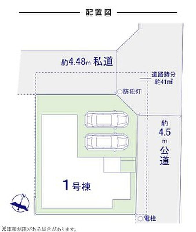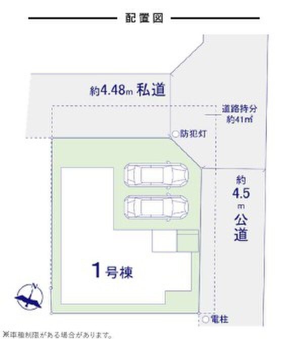 | 駐車場 | 1台 ~ 2台 | 道路の幅員 | 北西側私道4.48m、北東側公道4.5m |