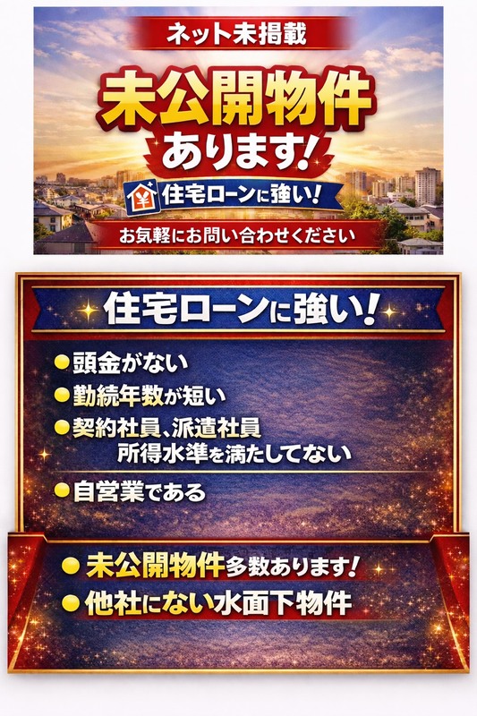 ◆即日見学ご対応致します◆ 今すぐ見学したい…最短10分でご対応致します!! 夜間に見学したい…夜間の見学ご対応致します!! 最寄り駅まで迎えに来て欲しい…無料送迎御座います!! ◆住宅ローン強化店◆ 「どこの銀行で借りよう…」 「他社で仮審査落ちた…」 「頭金が用意出来ない…」 お任せください!! 住宅ローンアドバイザーが多数在籍していますのでローンに関する お悩み全て解決させて頂きます!! ◆お子様連れのお客様も大歓迎◆ 当店キッズスペースを完備しておりますので お子様連れでもゆったり過ごせるような空間をご提供致します!! |