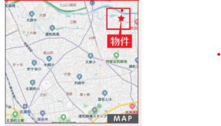 JR京浜東北・根岸線「北浦和」駅 バス19分「北宿」バス停 徒歩7分 JR京浜東北・根岸線「浦和」駅 バス25分「北宿」バス停 徒歩7分 |