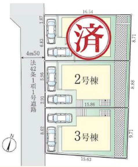 | 建物面積 | 107.64m2(2号棟)(3号棟) | 土地面積 | 142.17m2(2号棟)~144.34m2(3号棟) |