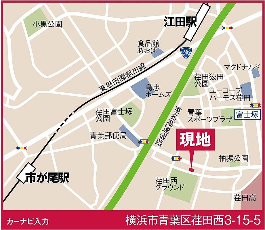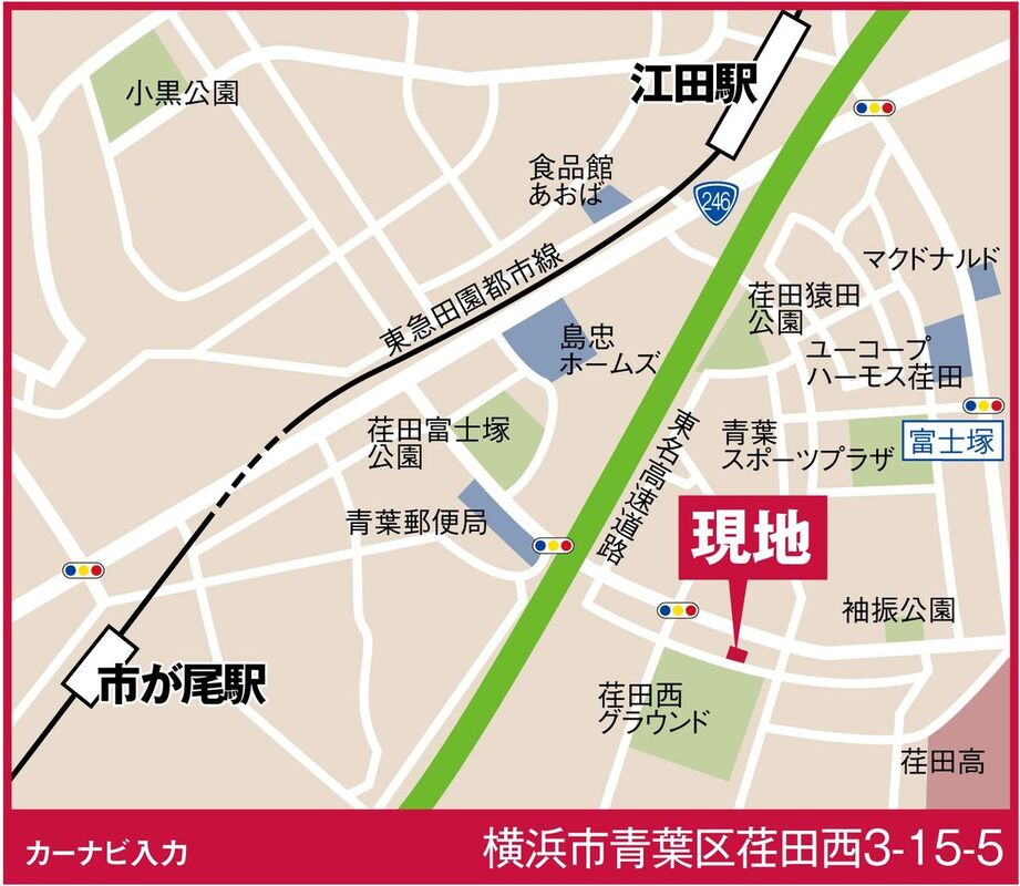 東急田園都市線「江田」駅 徒歩11分 東急田園都市線「市が尾」駅 徒歩15分 横浜市営地下鉄ブルーライン「あざみ野」駅 徒歩28分 |