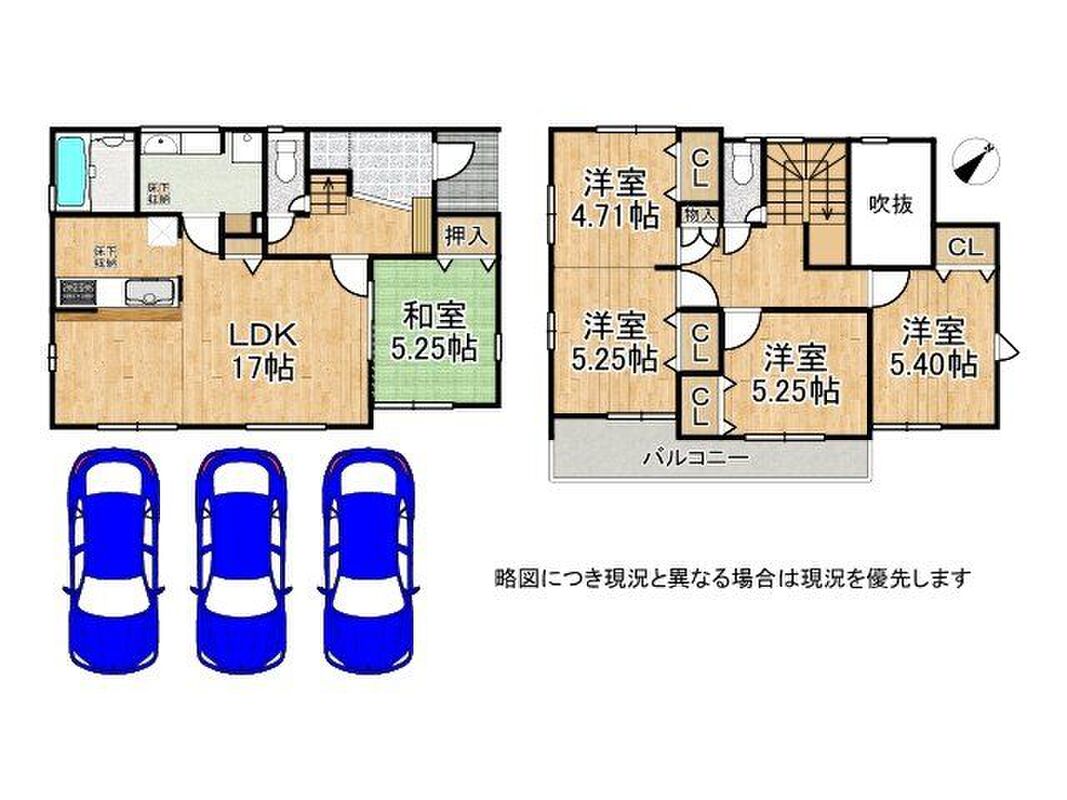 - 4LDK-LDK17帖 並列駐車3台 吹抜 各室収納完備 和室 床下収納