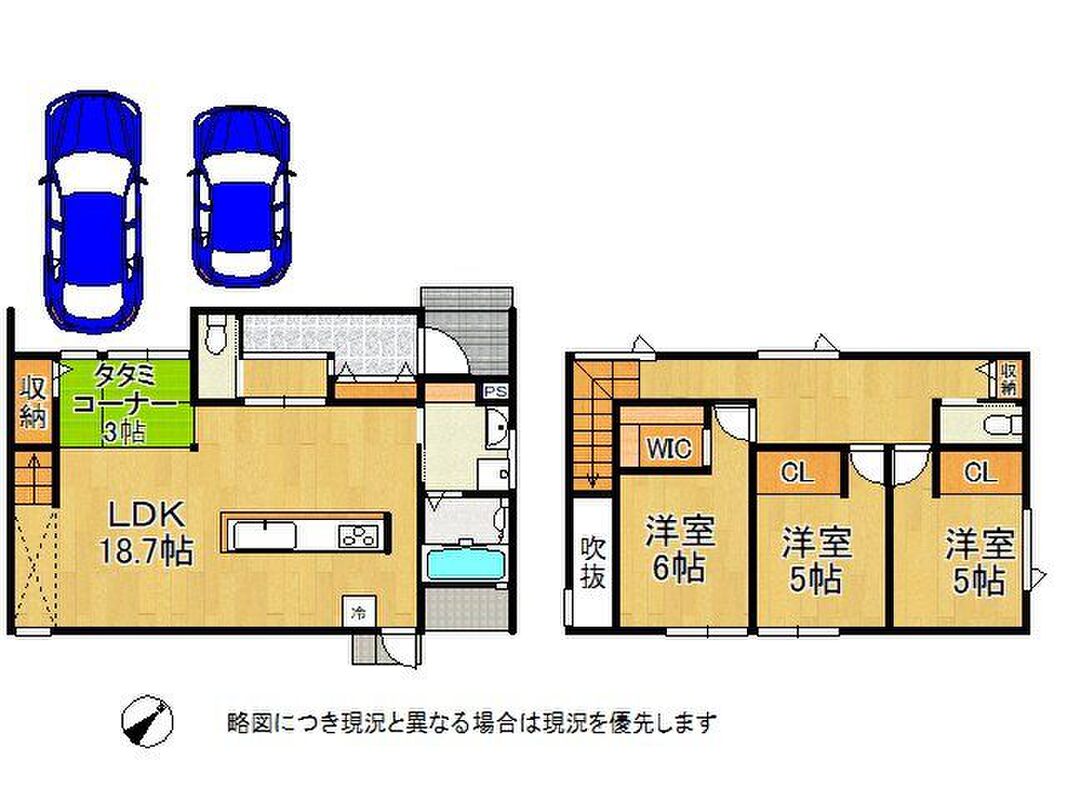 ■特徴・ご家族の様子を見ながら料理ができる対面式キッチン・LDKにはタタミコーナーで21.8帖の広々空間・洗面脱衣室や2Fホールにも収納棚あり・吹付断熱×全窓樹脂サッシ・ペアガラス