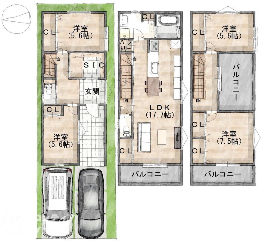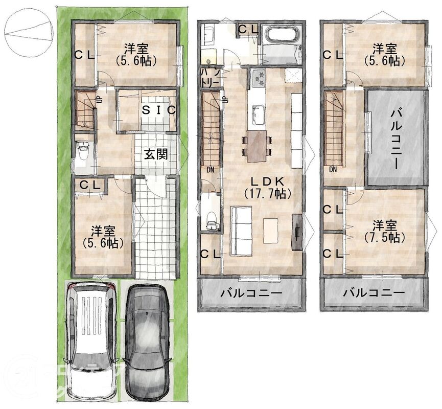 - ※完成予想図やCG合成画像は、門塀・植栽・庭・外観等、実際とは多少異なる場合があります。