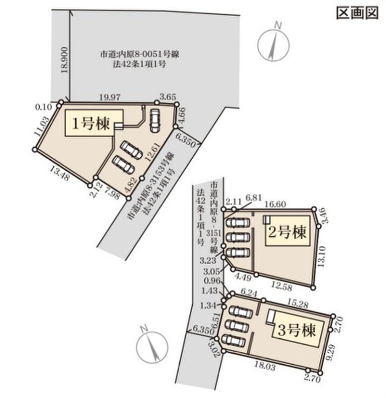 | 駐車場 | 3台 | 道路の幅員 | 北側18.9m公道・東側6.35m公道・西側6.35m公道 |