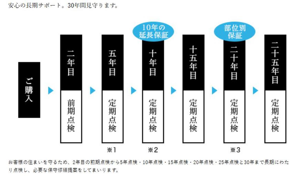 デザイン性だけではありません。お客様の住まいを守るため、2年目の前期点検から5年点検・10年点検・15年点検・20年点検・25年点検と30年まで長期にわたり点検し、必要な保守修繕提案をする手厚いアフターサポート。また、建物が不同沈下しない地盤品質を”最大20年間”保証します。※エリアにより保証期間が異なります。