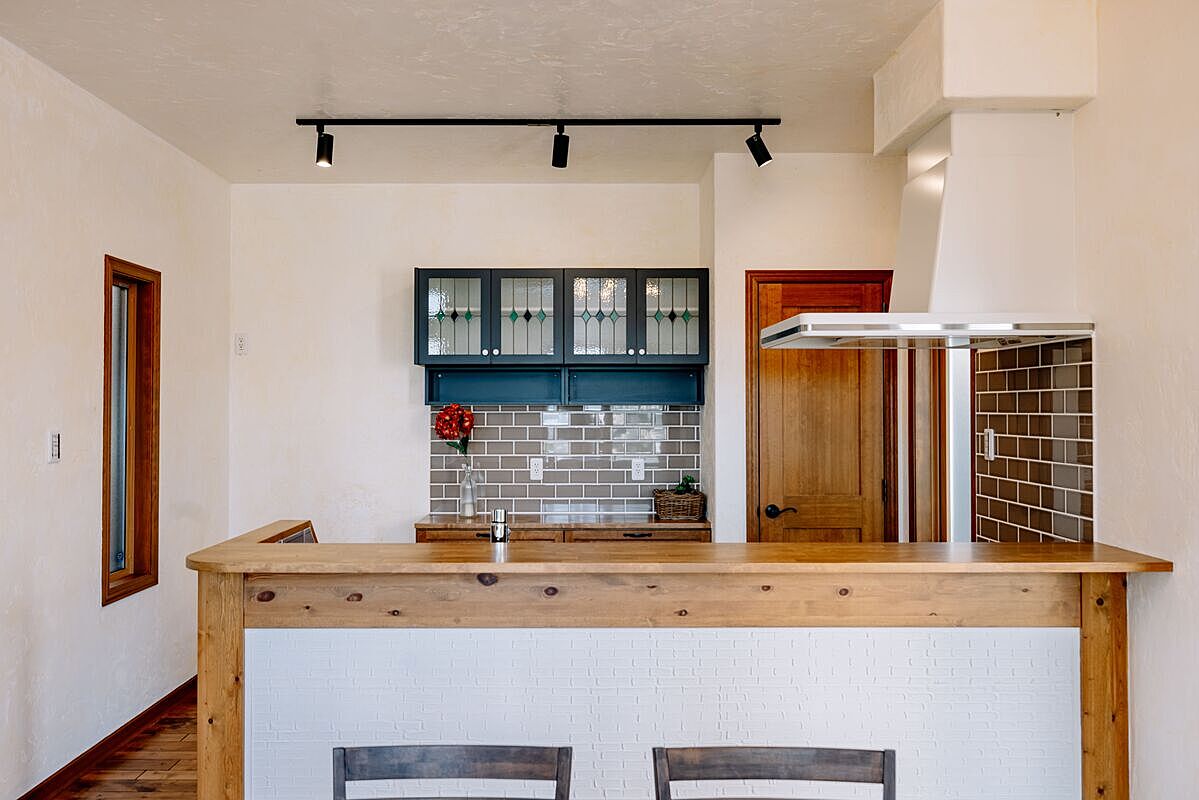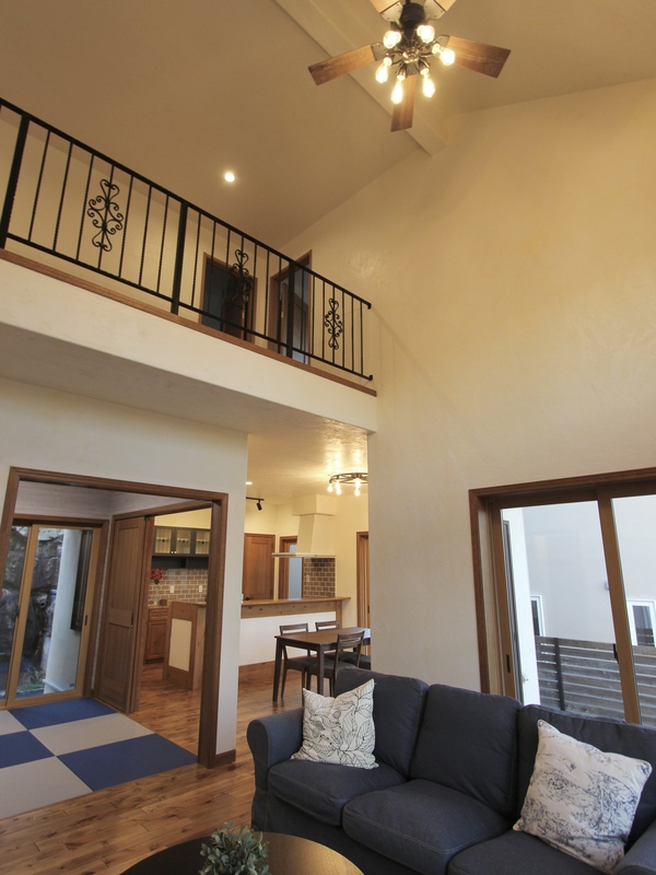 吹き抜けが開放的な明るいリビング、キッチンは使い勝手抜群の日本製。カウンターやキャビネットなどはアンティーク風にアレンジ。採光抜群のダイニングはいつでも明るい雰囲気...