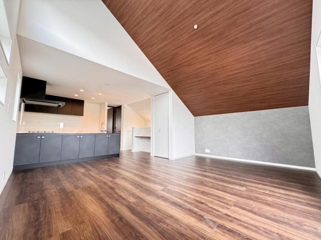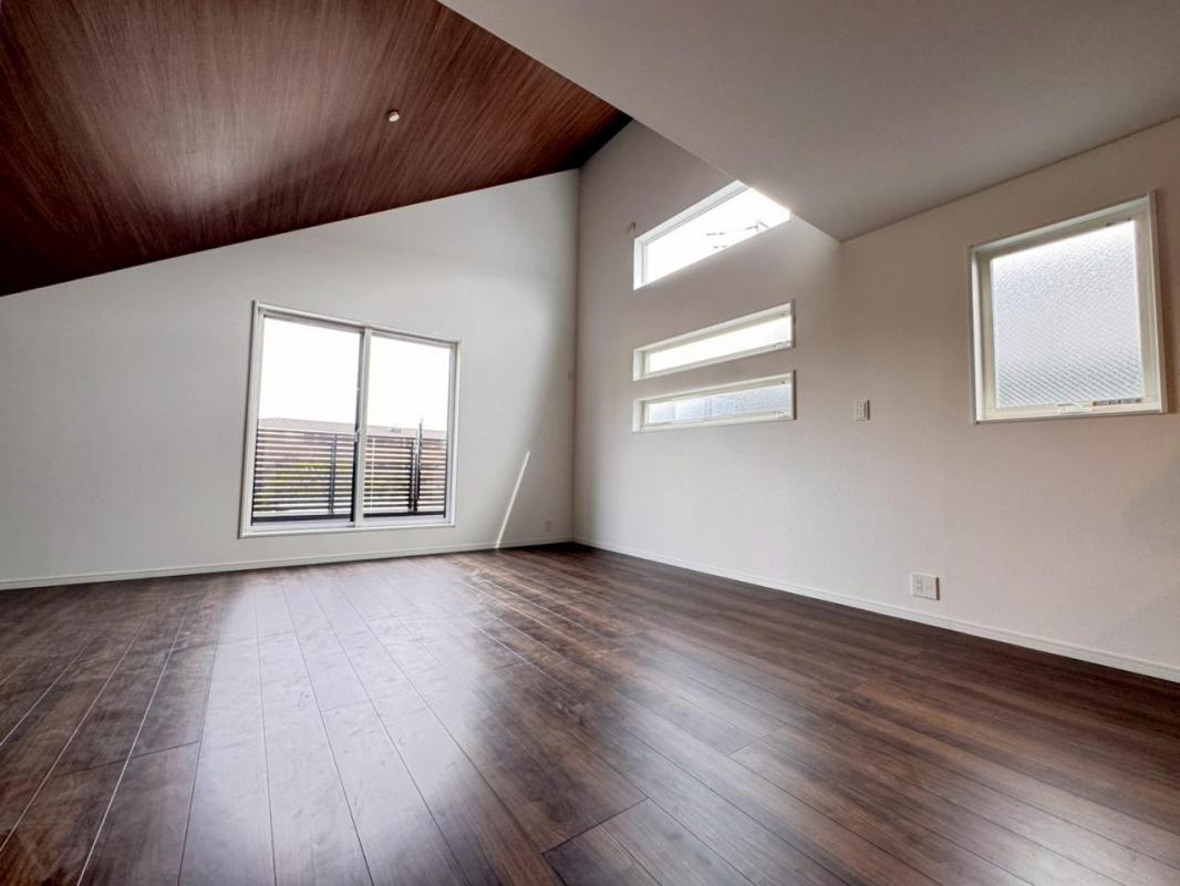 ◆リビング上部を勾配天井にする事で抜群の開放感を演出しております。暮らしの中心となる場所だからこそ快適性に拘りました。一日中、明るく輝きに満ちた空間を演出しております。