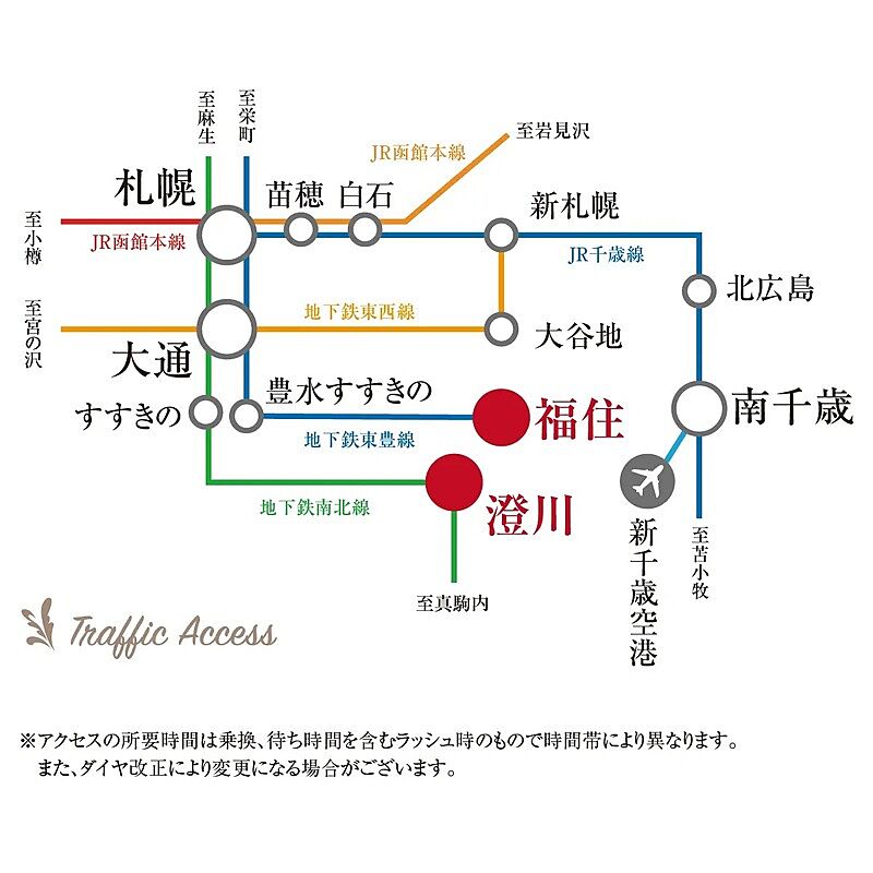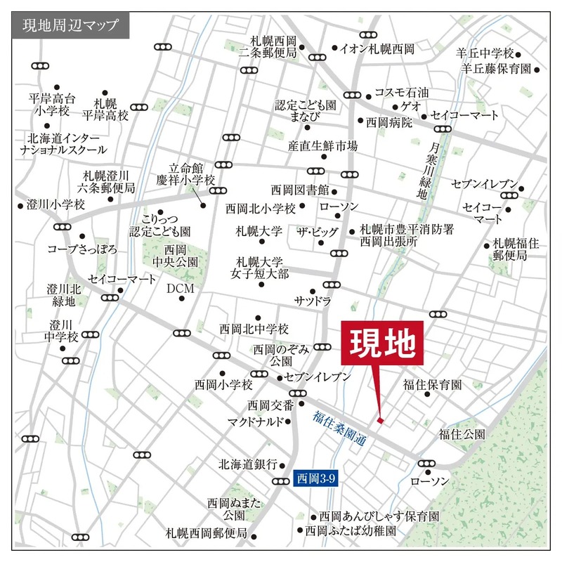 札幌市営東豊線「福住」駅 徒歩27分 札幌市営南北線「澄川」駅 徒歩30分 札幌市営東豊線「福住」駅 バス便10分 「福住2条9丁目」バス停 徒歩2分 |