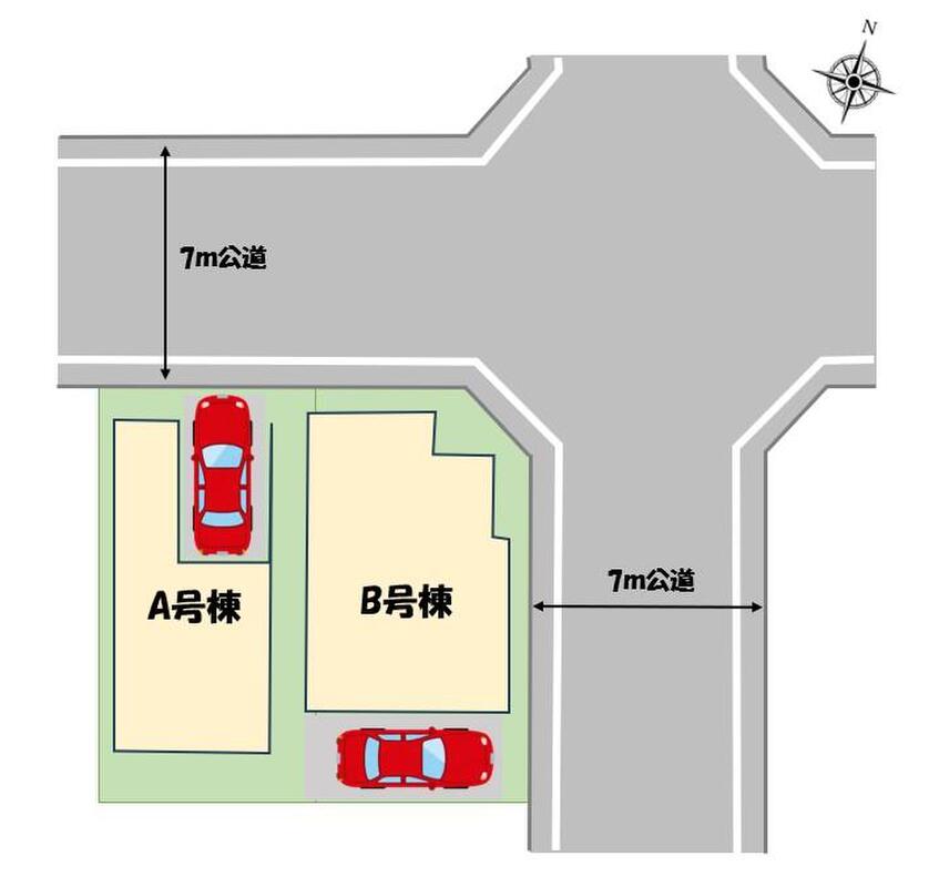 | 駐車場 | 1台(車種による) | 道路の幅員 | 道路幅:7m、アスファルト舗装、(B号棟)角地 : 東 7m 公道、北 7m 公道 |