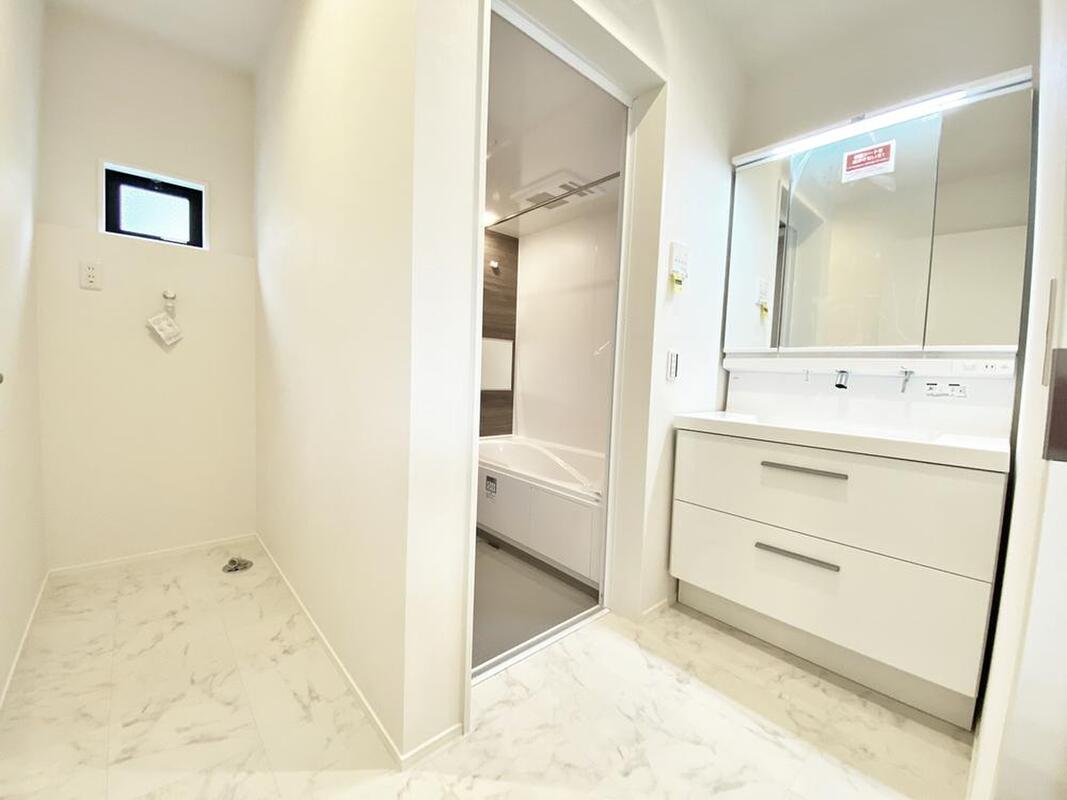 明るく清潔感溢れるサニタリースペース。毎日使う場所だからこそ、快適な空間になっています。女性にはうれしい3面鏡化粧台。鏡の裏が収納になっている機能的なタイプです!
