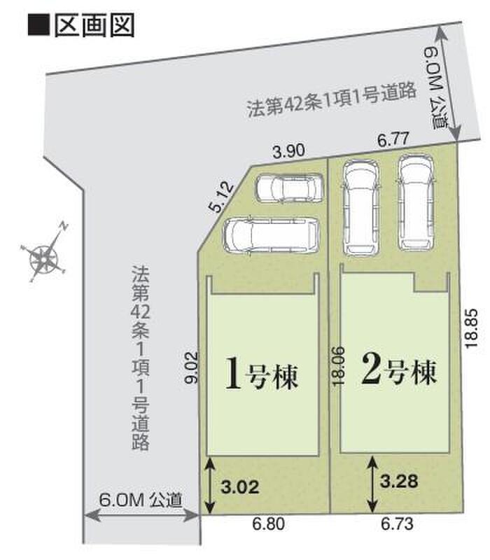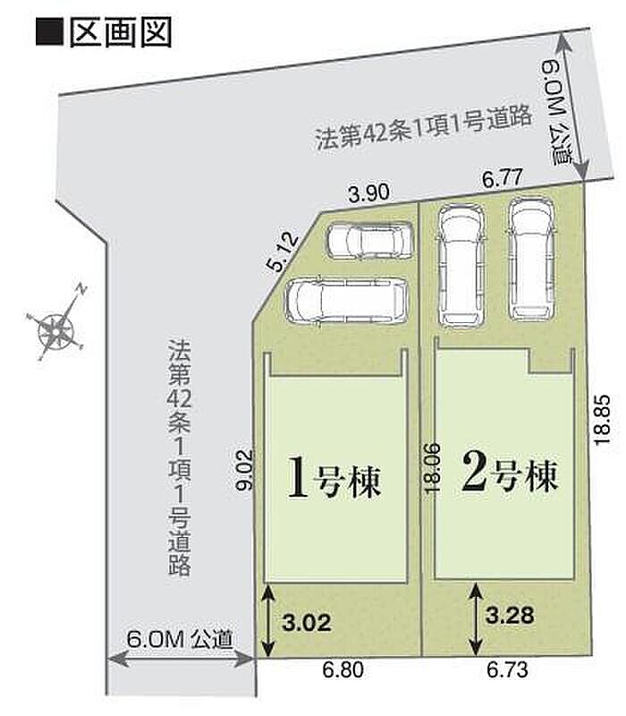 | 駐車場 | 2台(車種による) | 道路の幅員 | 道路幅:6m、アスファルト舗装、南西側6.0m公道、北西側6.0m公道 |