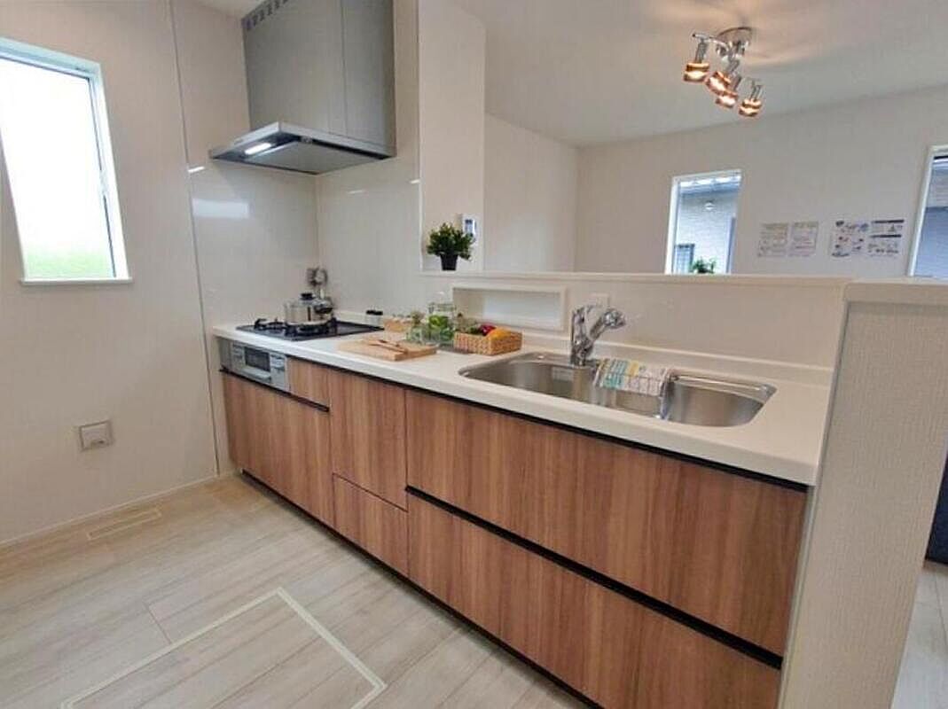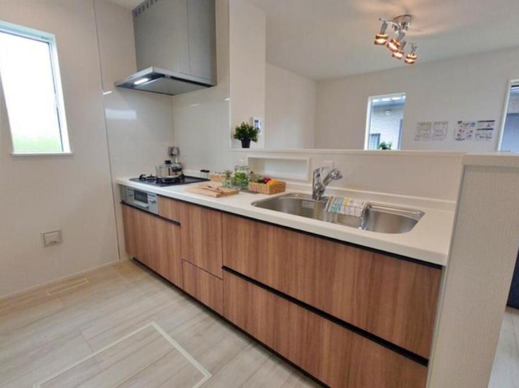 システムキッチン採用!収納豊富で見栄えも良く、お手入れもスムーズです♪カウンターキッチンでリビングが見渡せるので、お子様を見守りながらお料理も出来るので安心です!