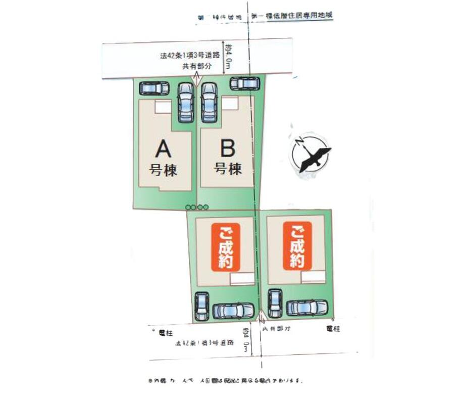 | 駐車場 | 2台(車種による) | 道路の幅員 | 道路幅:4m、アスファルト舗装、A号棟 北東:4m B号棟 北東:4m |