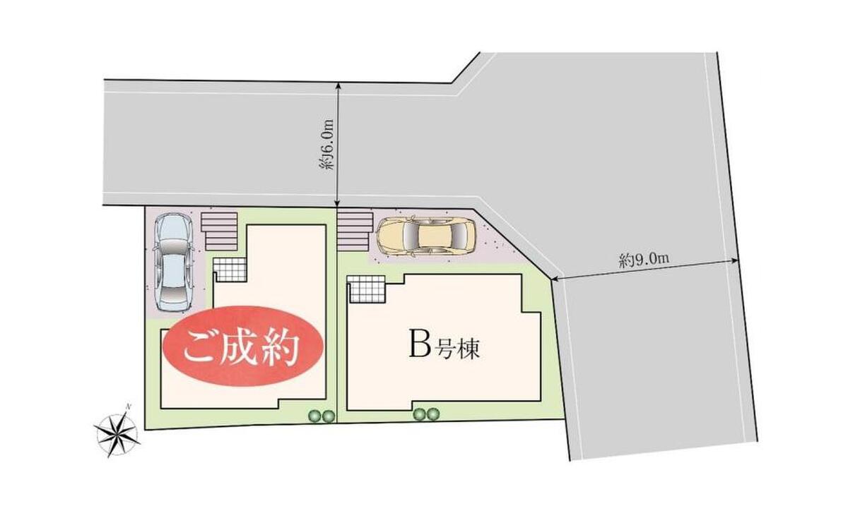 | 駐車場 | 1台 | 道路の幅員 | 道路幅:6m・9m、アスファルト舗装、北 6m 公道、東 9m 公道 |