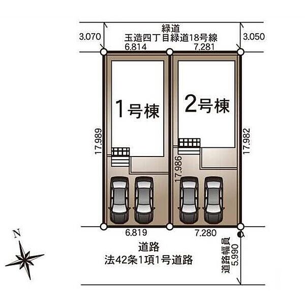| 駐車場 | 2台(車種による) | 道路の幅員 | 道路幅:6m、アスファルト舗装、南西側約6m公道 |