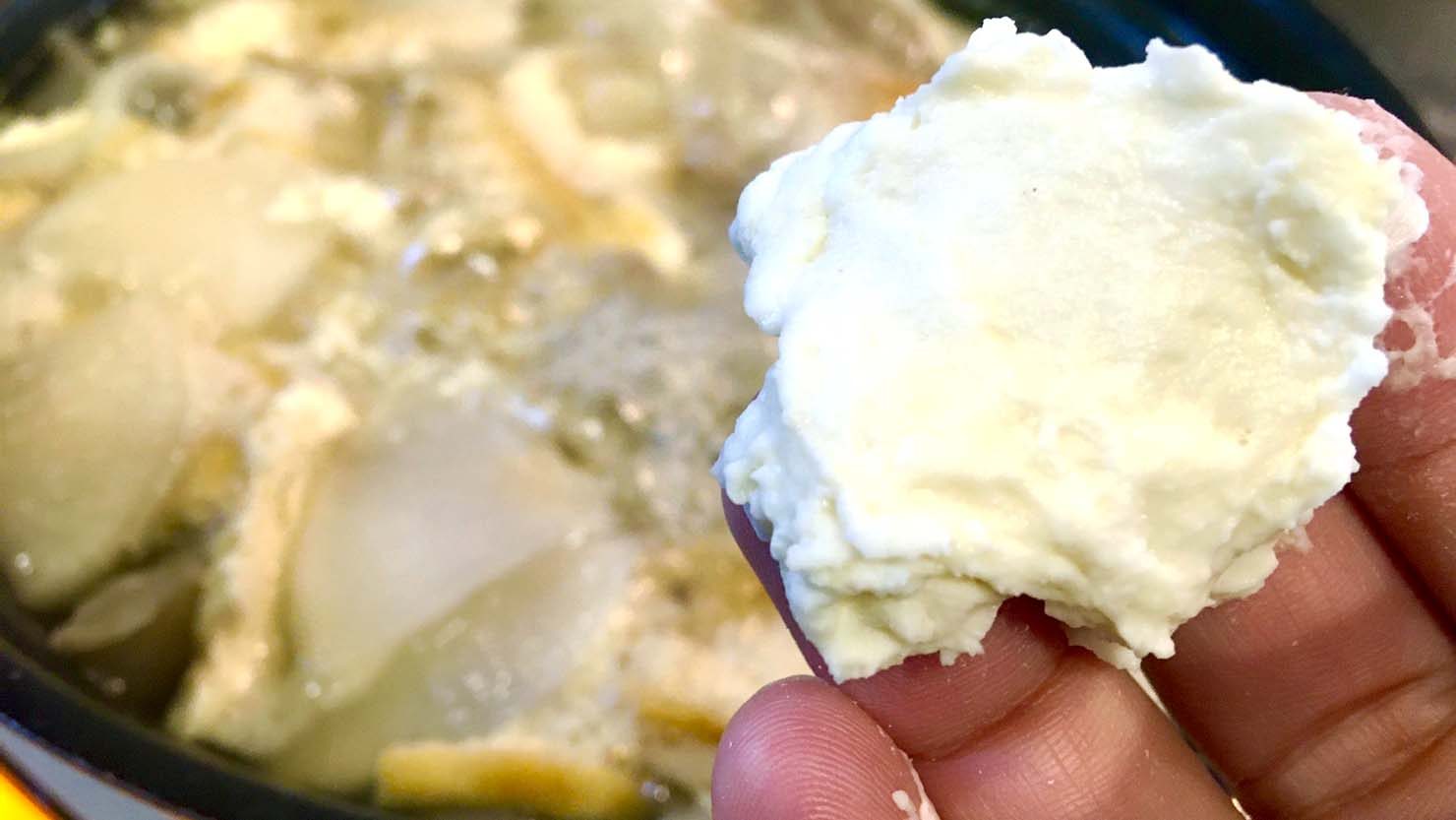 ⑥冷蔵庫で寝かせておいただごを一口大にちぎり、平たくしながら煮立った鍋に投入します。