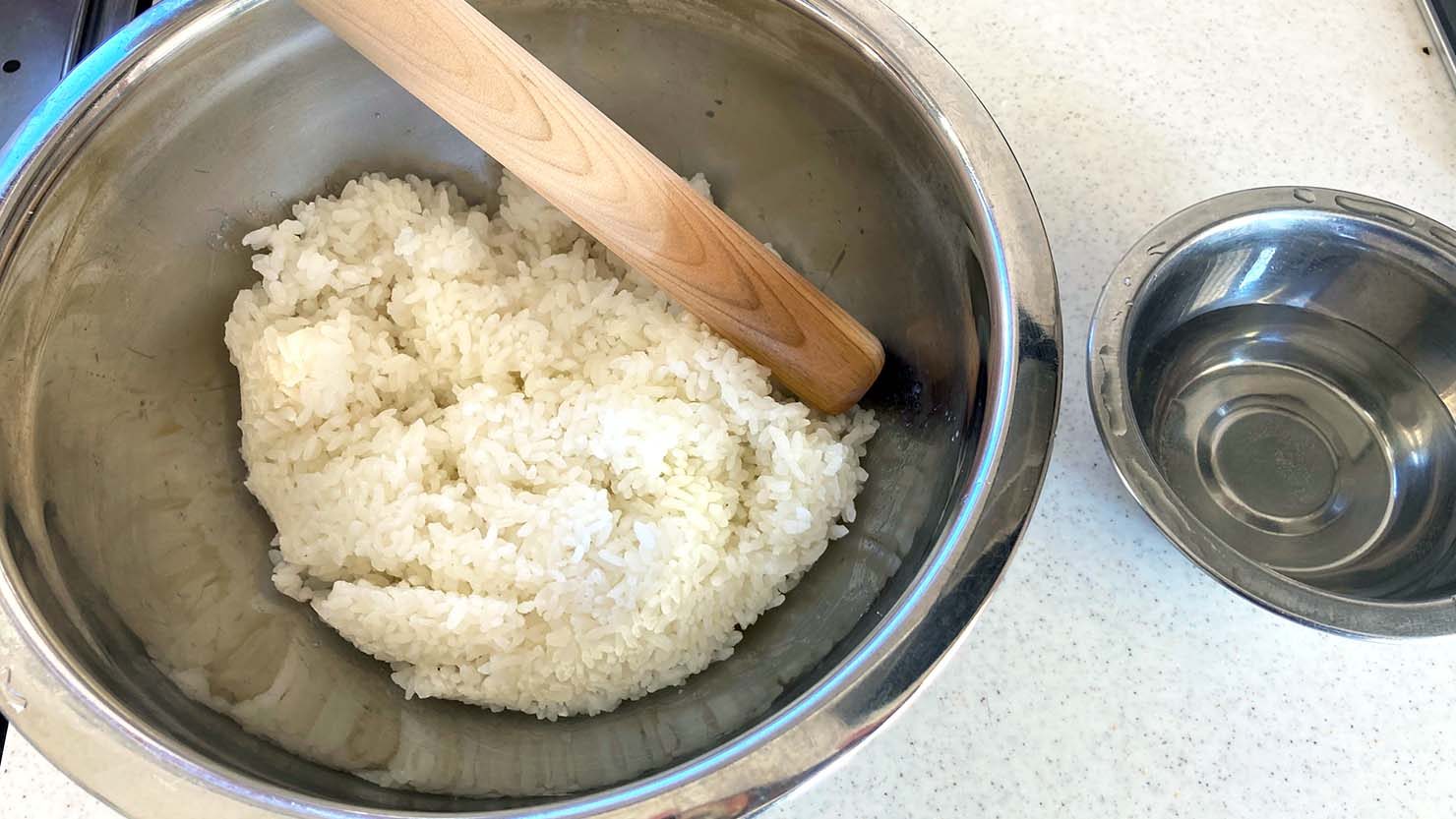 ③塩水が付いたすりこぎでお米の粒が少し残るまで潰していきましょう。潰しているとお米がすりこぎにくっつくので、随時すりこぎに塩水をつけます。出来上がりの目安としては、お米に粘り気が出て、丸めたときに崩れない固さになれば問題ないです。