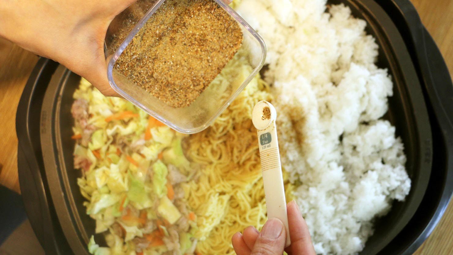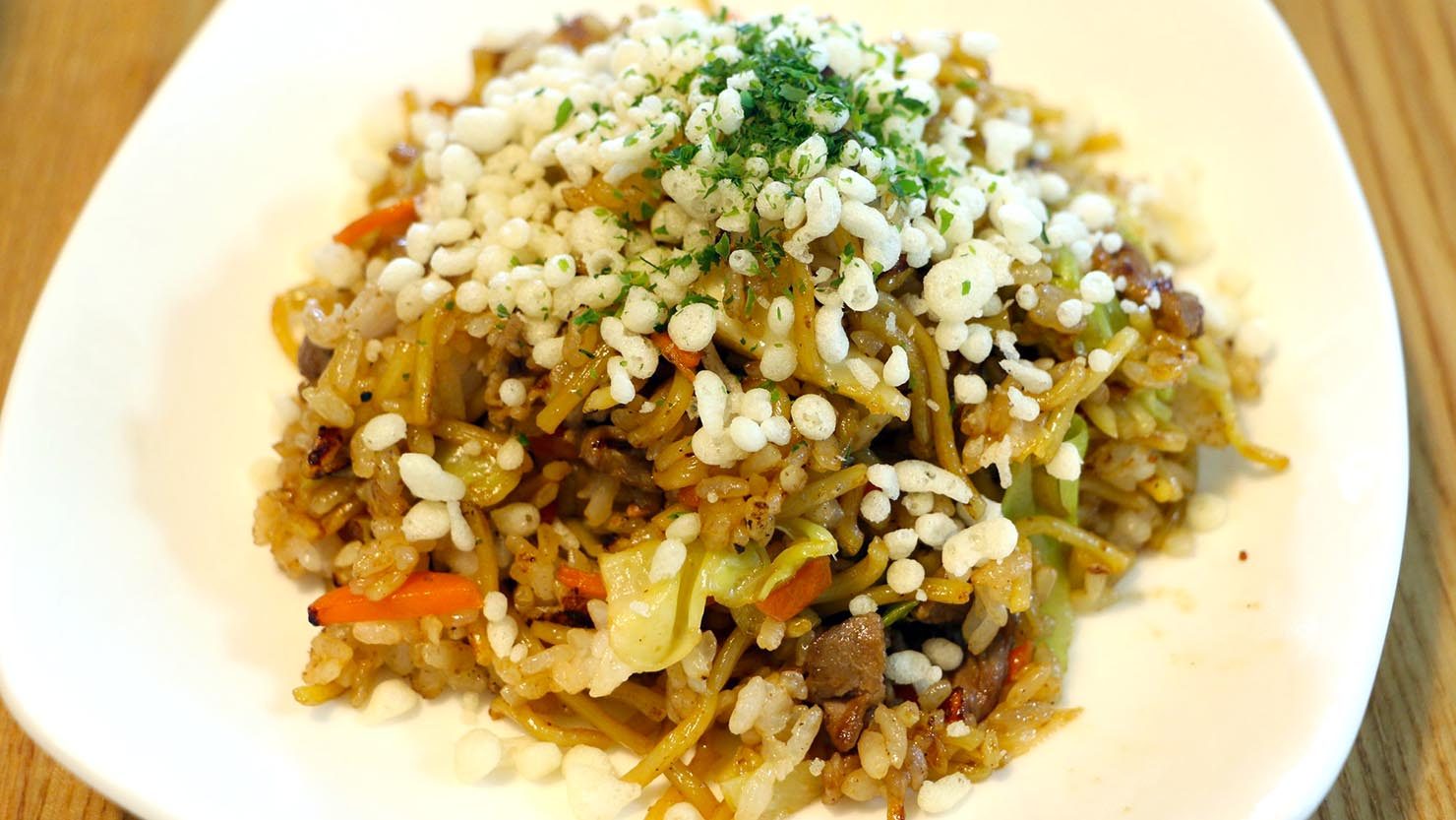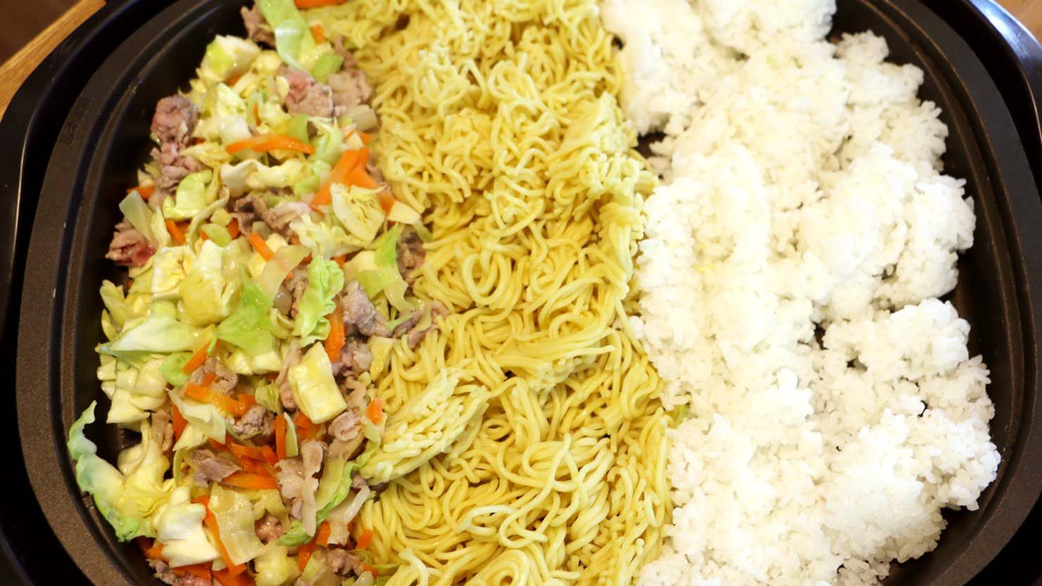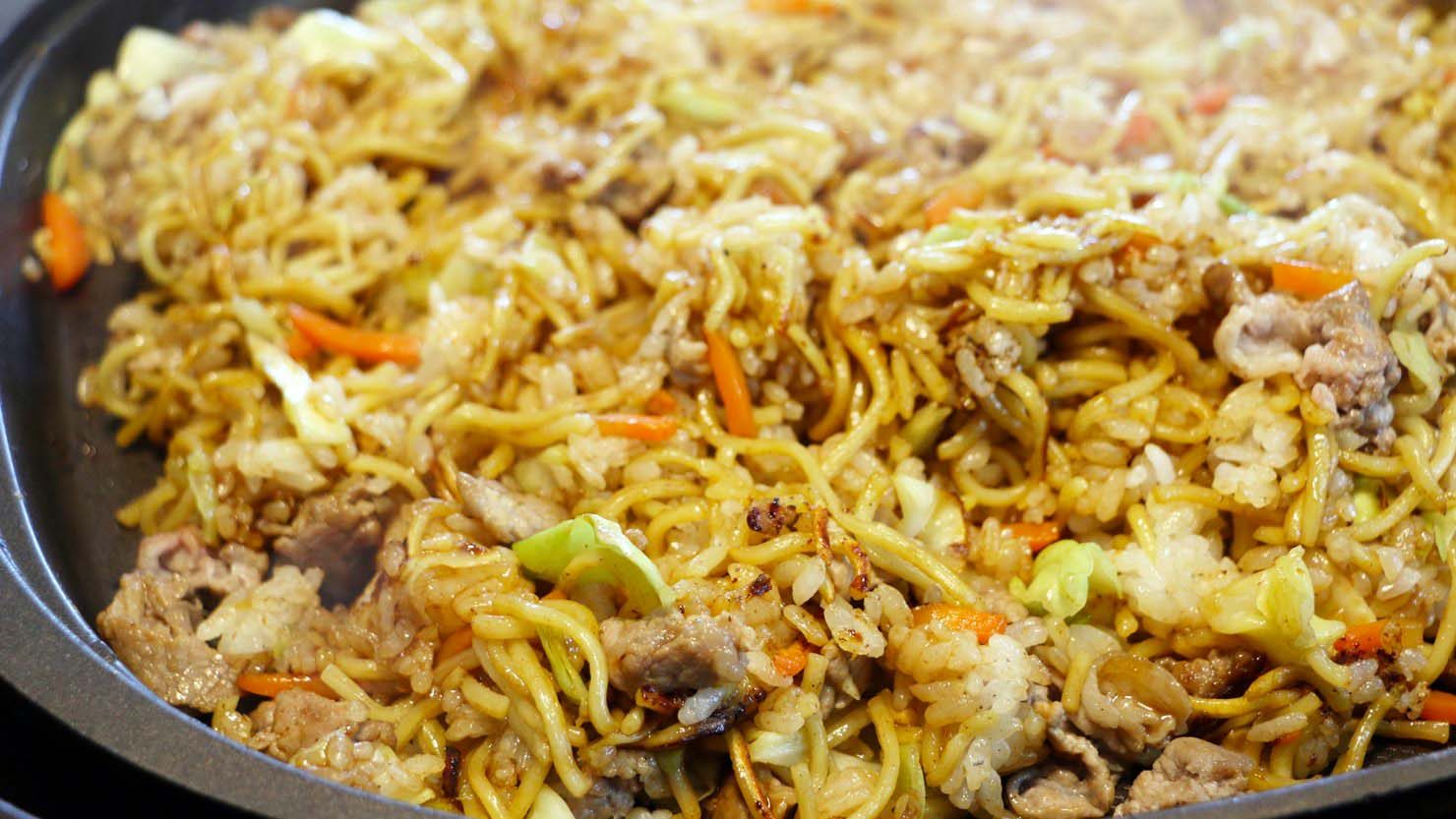基本的なつくり方は、焼きそばと同じ。鉄板上で一口サイズに切った野菜やお肉を炒めたあと、茹で中華麺と冷やご飯を入れて麺が細かくなるよう切り刻みながら混ぜ合わせ、お好みソースなどでお好きな味に調えるだけです。