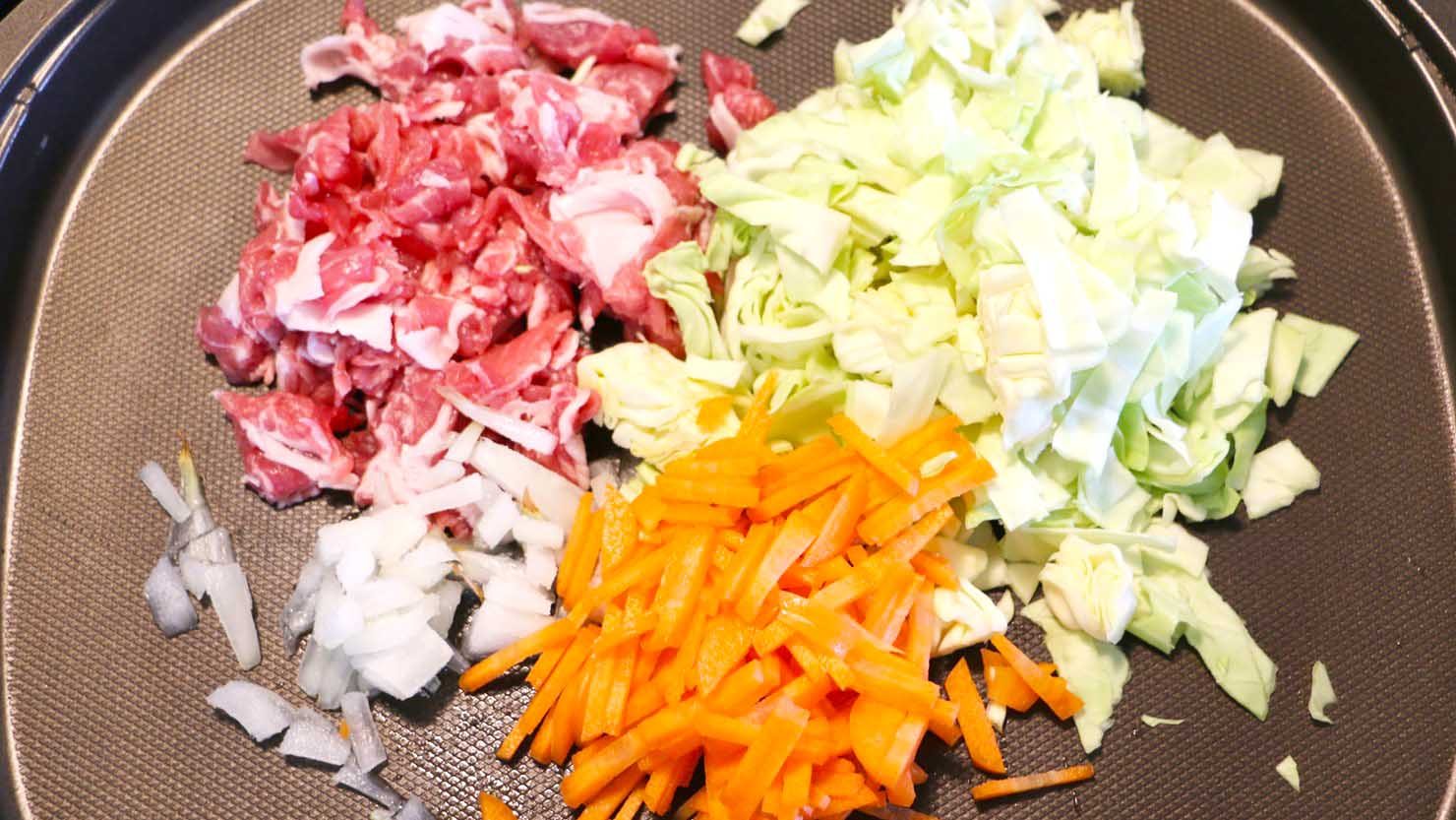 ① キャベツ・人参を粗みじん切りに、豚バラ肉は1cm角くらいに、中華麺は2㎝程の長さに切っておく。