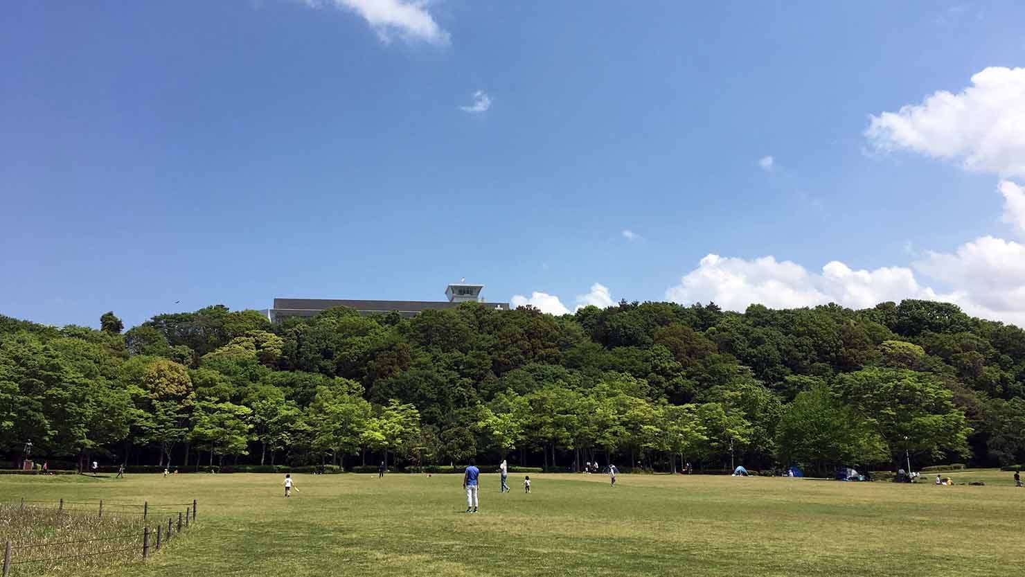 松戸市にある21世紀の森と広場。公園内を小川が流れているので、夏は川遊びもできます。広い芝生ゾーンもあるため、ボール遊びなども思いっきりできます。テントを張って1日中過ごす家庭も多いですね。