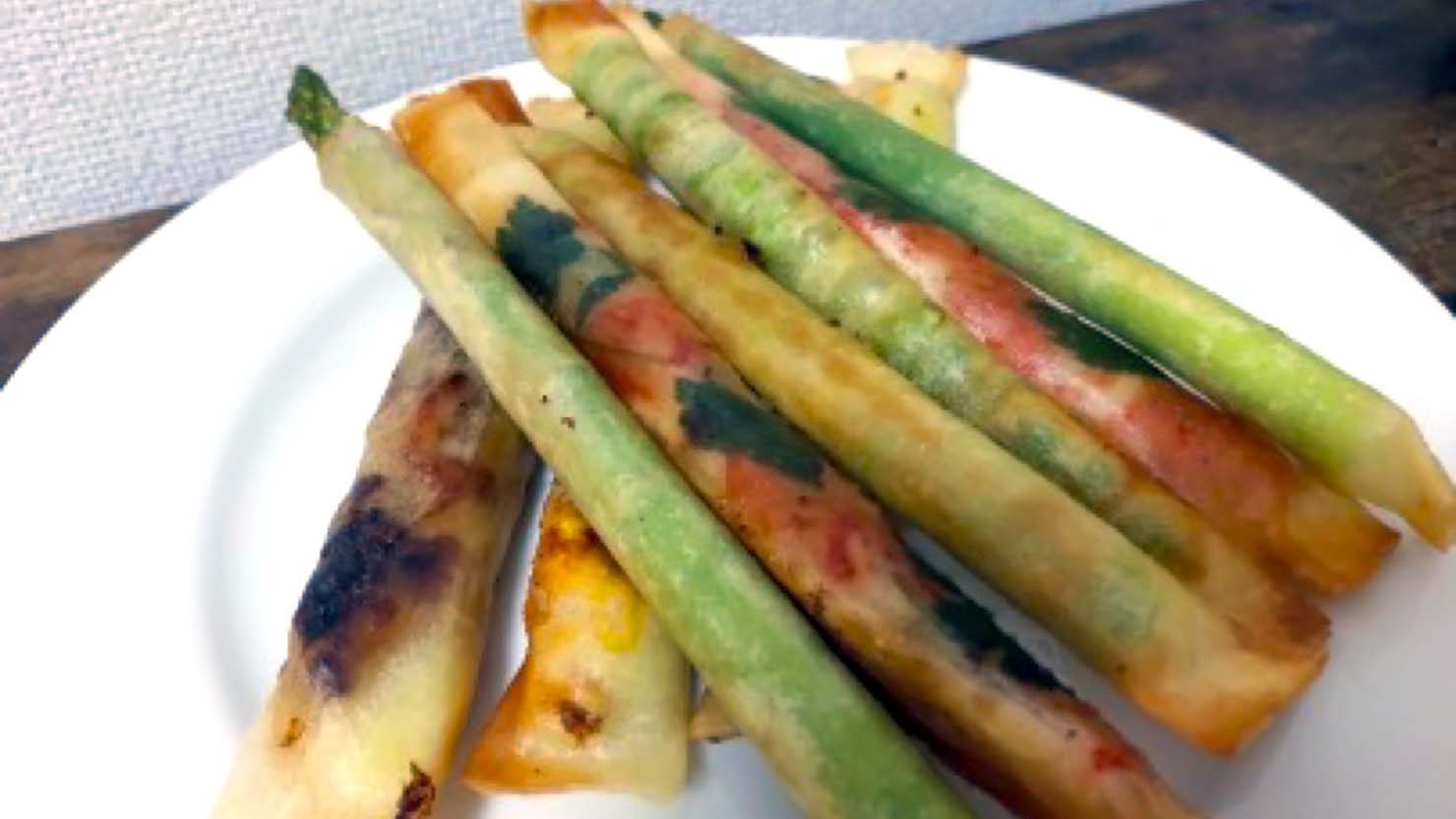 春巻きの皮から色とりどりの野菜が透けて見え、食べる前から見た目も楽しむことができるお花見のおともです。アスパラ、トマト、コーンなど色が濃いものを具材として入れるとカラフルで華やかです。