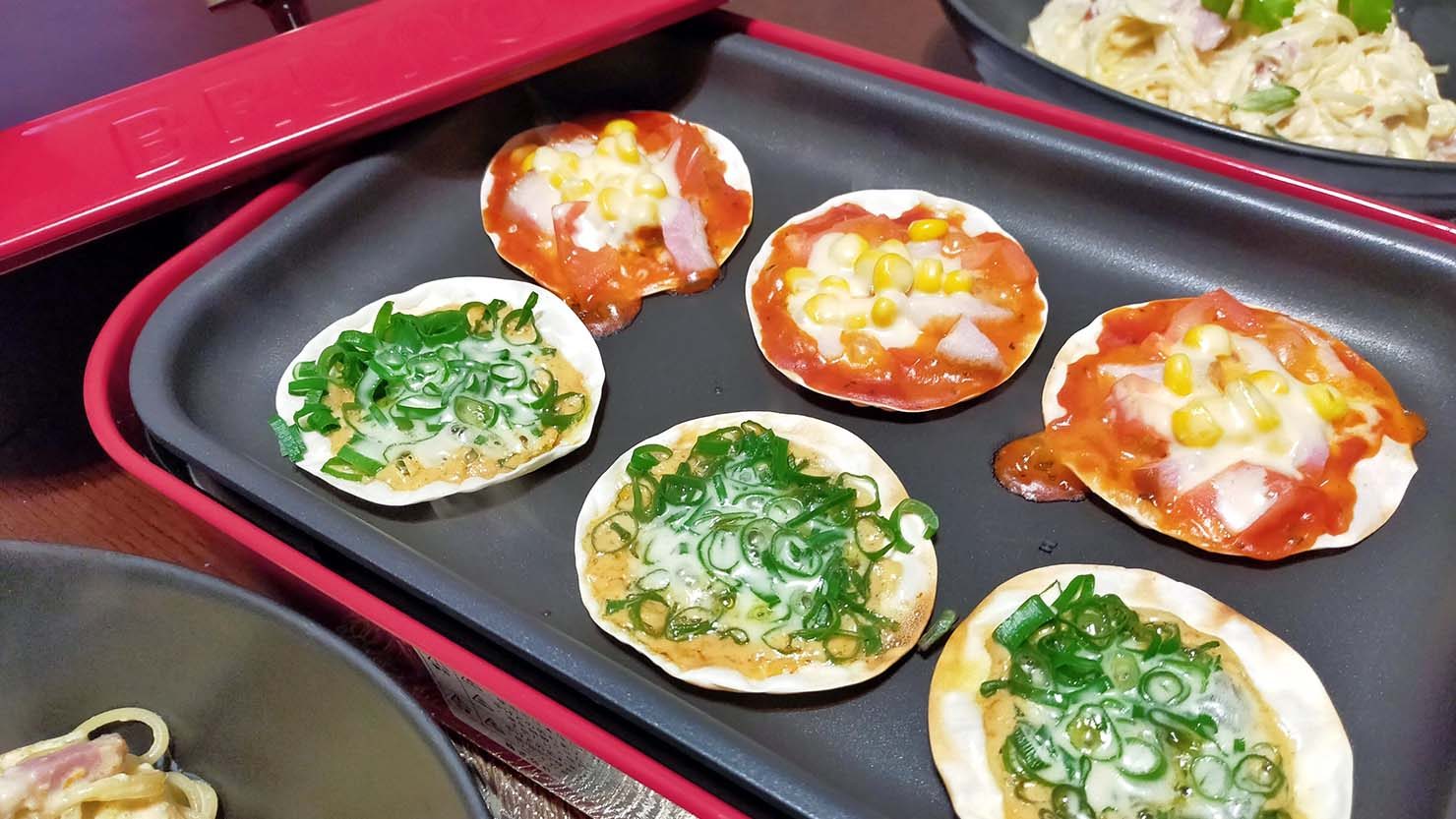 餃子の皮をピザ生地として使ったピザです。生地を作る手間も省けますし、自分好みの具でピザを楽しむことができます。具材を餃子の皮にのせて焼くだけの簡単な作業なので、お子さんと一緒につくっていただきたいと思います。