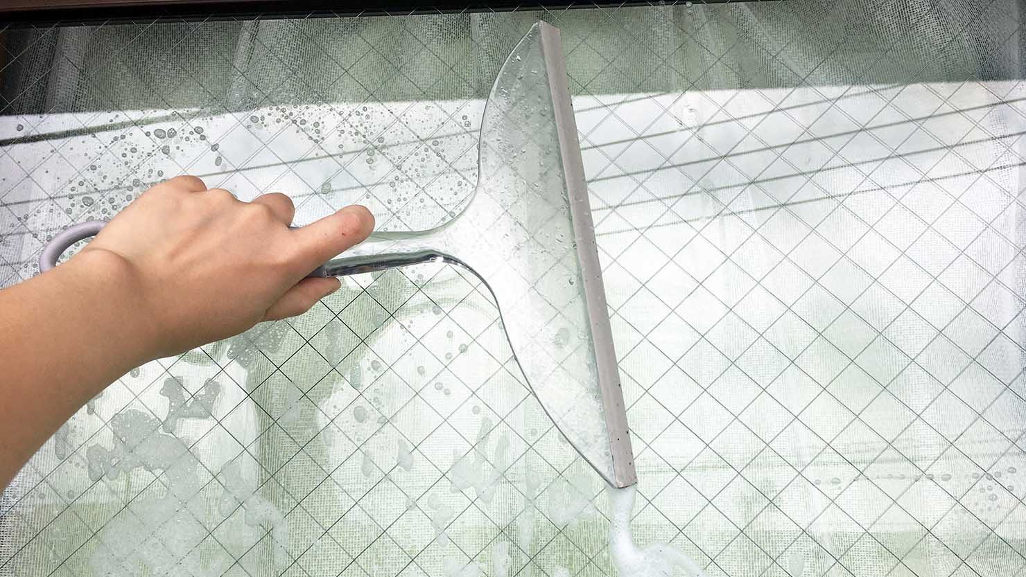 汚れが酷くなければ、窓に水をスプレーしてスクイージーで水を切っていくだけで大丈夫です。汚れが多いときは、窓用スプレーを吹きかけて汚れを浮かせてからスクイージーで洗剤を落としていきます。