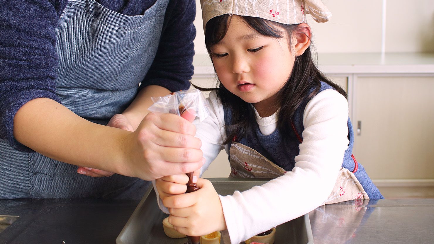 わが家ではお菓子作りに限らず、2歳頃からエプロンをつけて「キッチンに立つことは楽しいことなんだよ」と伝えてキッチンに立ってもらうことがあります。