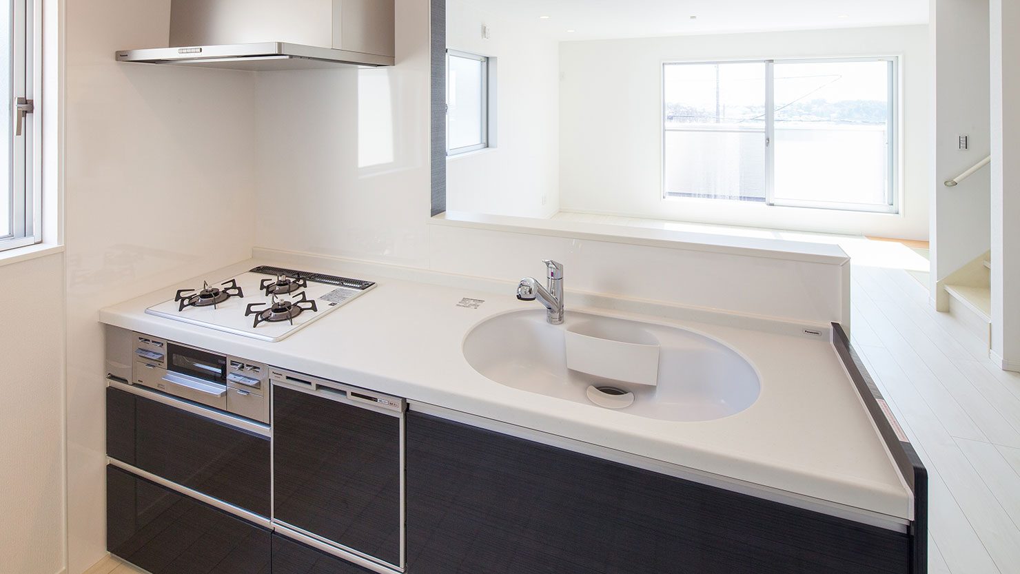 3歳のお子さまがいるお宅だったのですが、大人が料理の支度をしていても、子どもが手を洗っていても、対面キッチンなので部屋全体が見渡せます。
