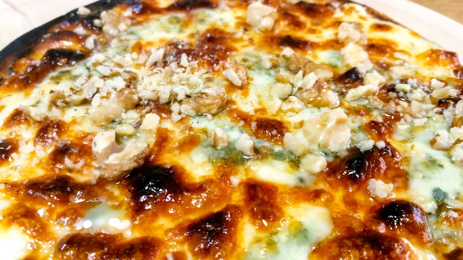 秋の雰囲気を感じられるクルミをアクセントに、チーズをたっぷりと使ったピザ。チーズを複数使うことで、コクが出て飽きのこない風味になります。