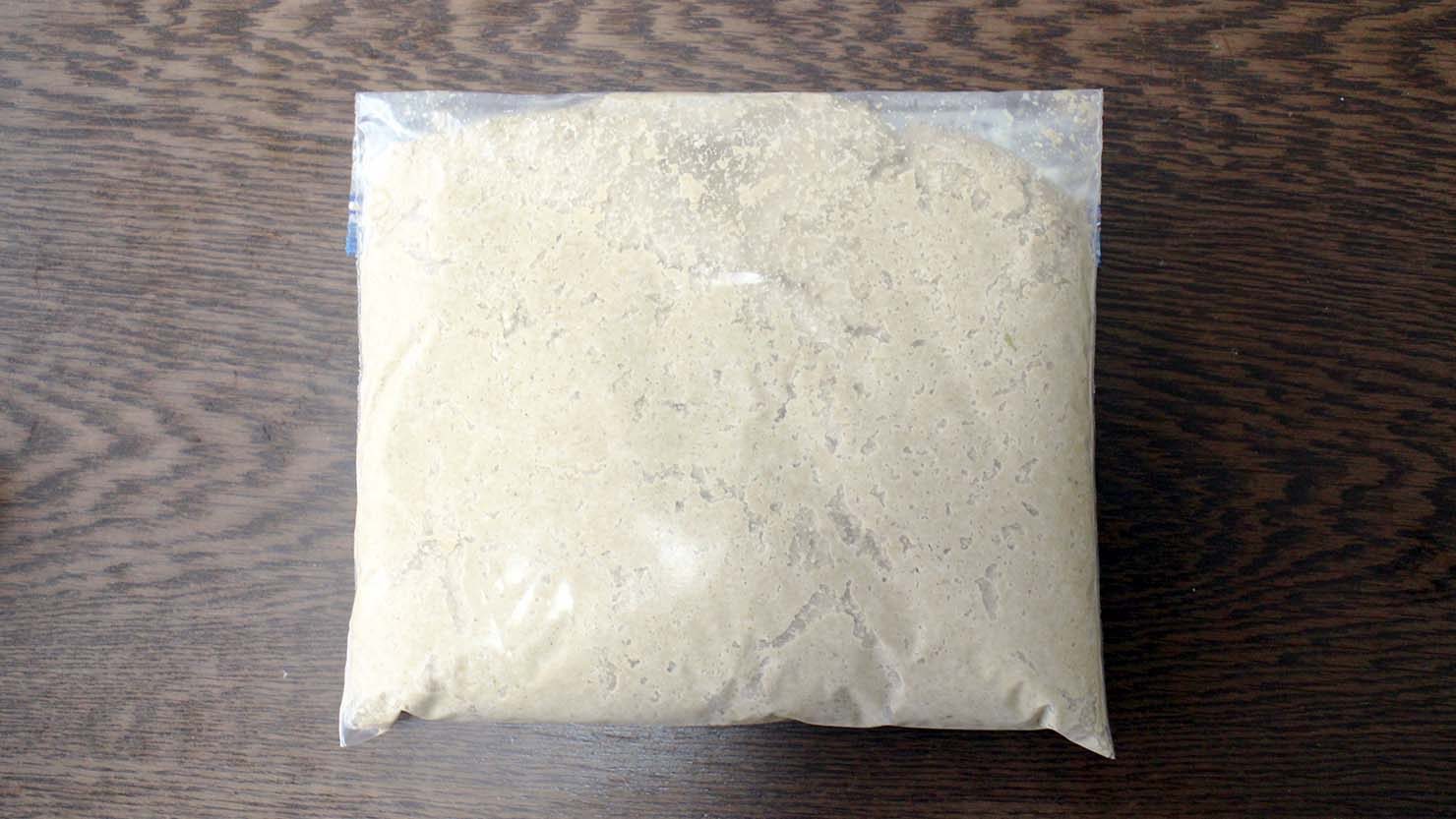 3.水を8割ほど入れて混ぜる。味噌程度の固さになるまで残りの水を少しずつ足し、様子を見ながら混ぜてぬか床を作る。べちゃべちゃにならないように注意すること