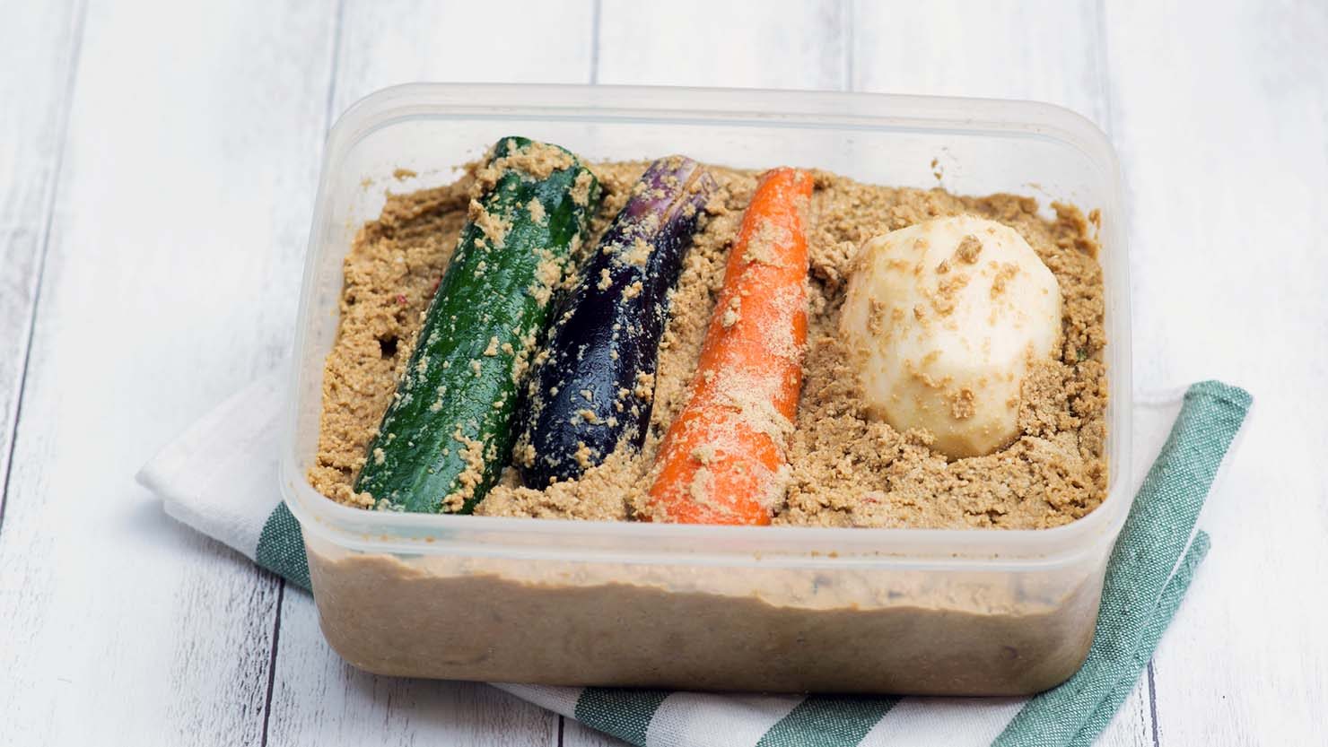 6.冷蔵庫に保管し、1日1回かき混ぜる。3~4日に1回、漬け捨て野菜は水分をぬか床で搾ってから、新しいものと入れ替える。漬け捨て野菜についたぬかは、なるべくぬか床に戻す