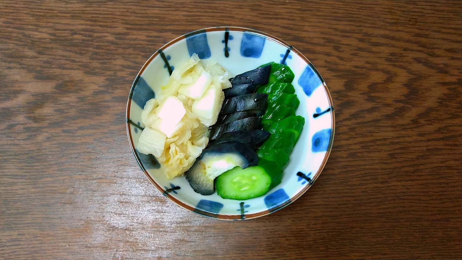 この日漬けたのは、なすときゅうりと大根です。明日の朝食と明後日の晩酌を楽しみに、ぬか床をかき混ぜ漬けこみます。