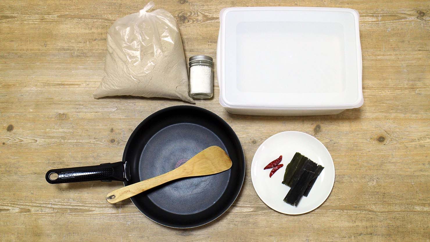 1.フライパンに米ぬかを計量カップ2杯程度入れて、こげないように弱火で5から10分ほど炒って炒りぬかを作る。別の容器に取り出して冷ます。この工程を繰り返し、用意した米ぬかを全部炒る