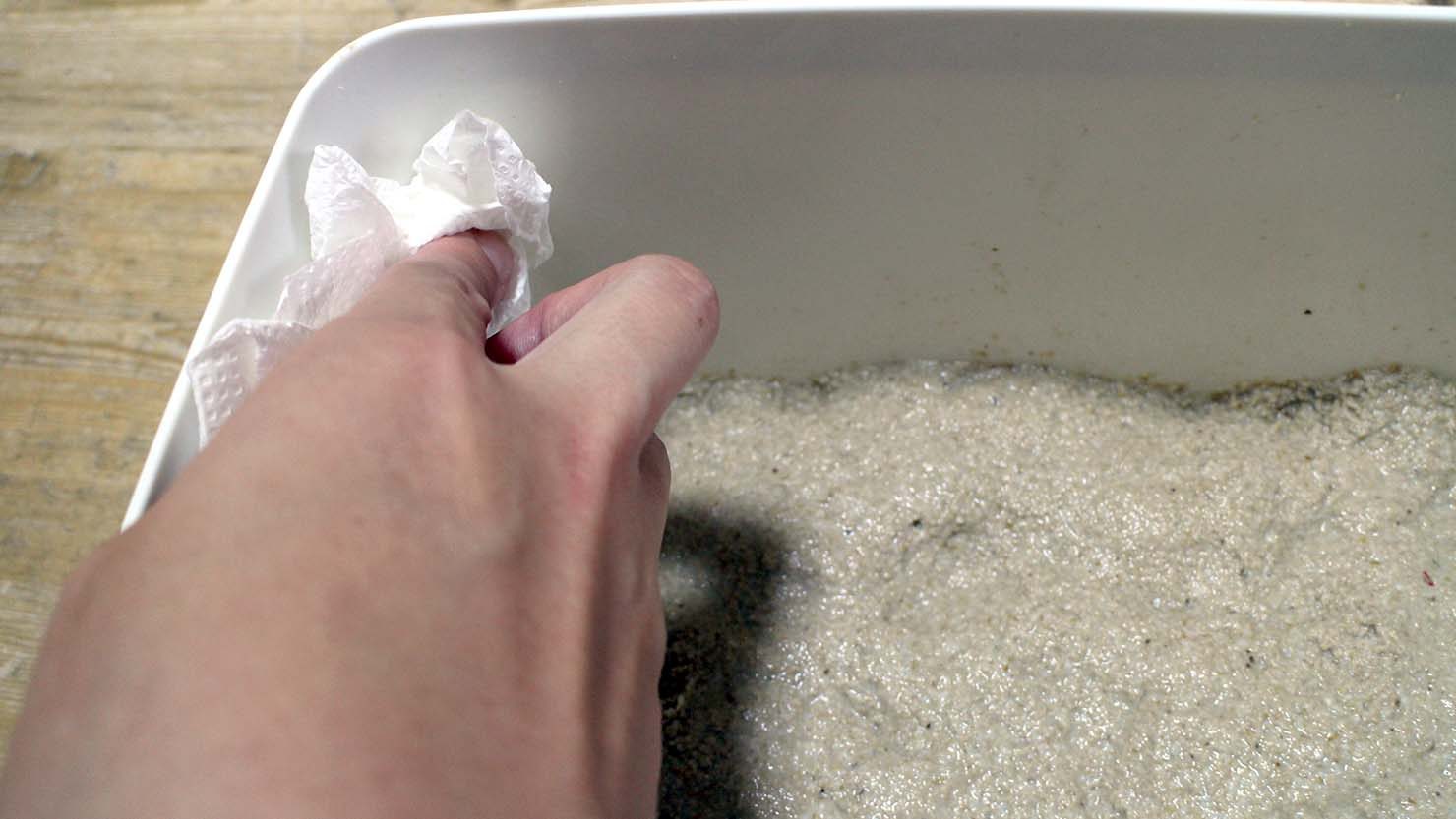 野菜から水分が出るので、どうしても水分が多くなりがちです。キッチンペーパーに吸わせたり、容器を傾けて直接水を捨てたりします。ぬか床の表面に傾斜をつけておくと、低い場所に水がたまるので処分しやすいですよ。