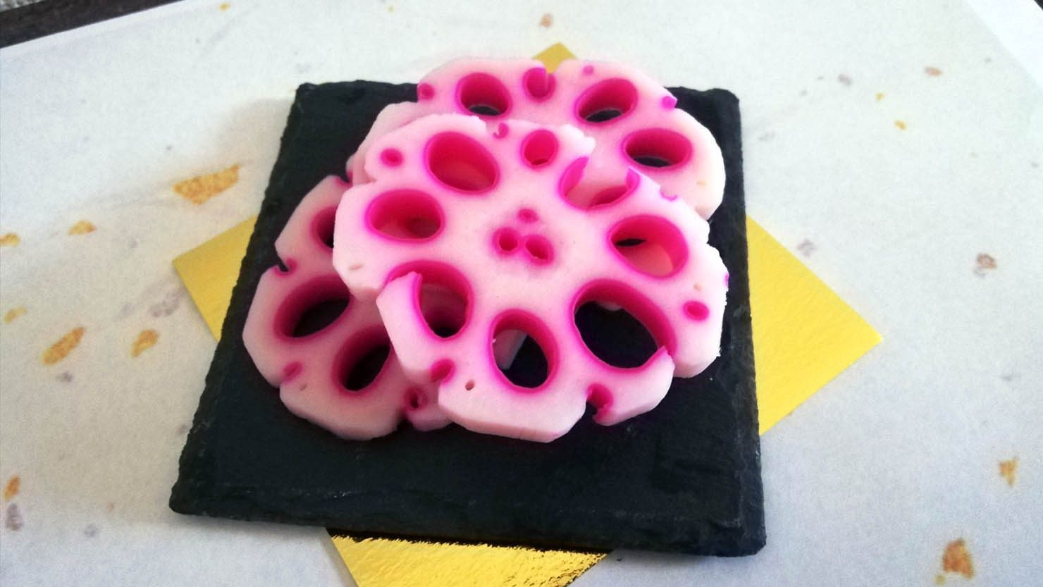 穴の形に添うように数ミリの厚さを残して飾り切りすると、蓮の花のように美しい花れんこんとして、おせちを華やかに彩ります。