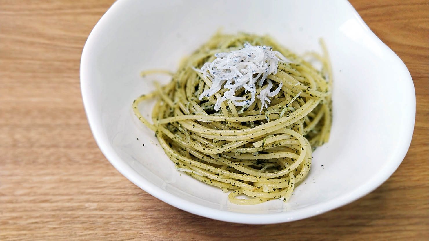 具がしらすだけのパスタだと家族から文句を言われてしまうのですが、粉末茶が入っているだけで一品として成り立ちました。