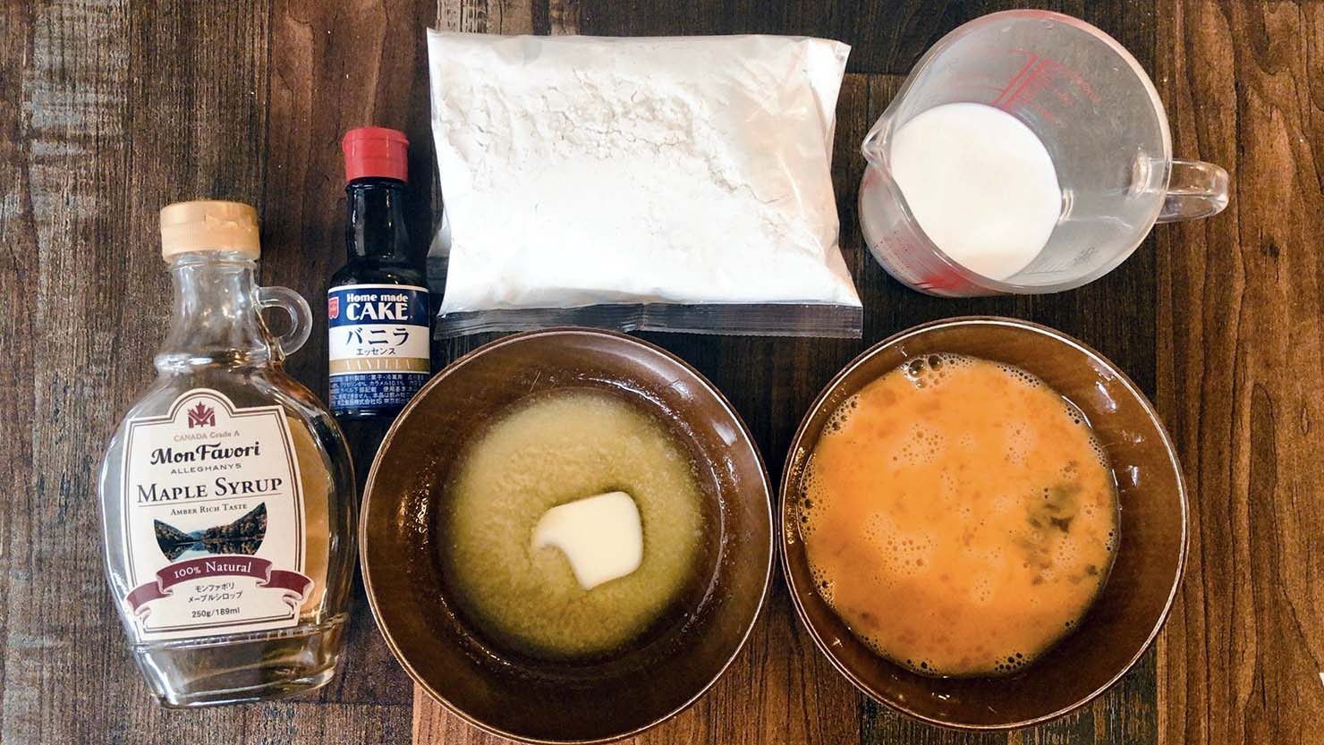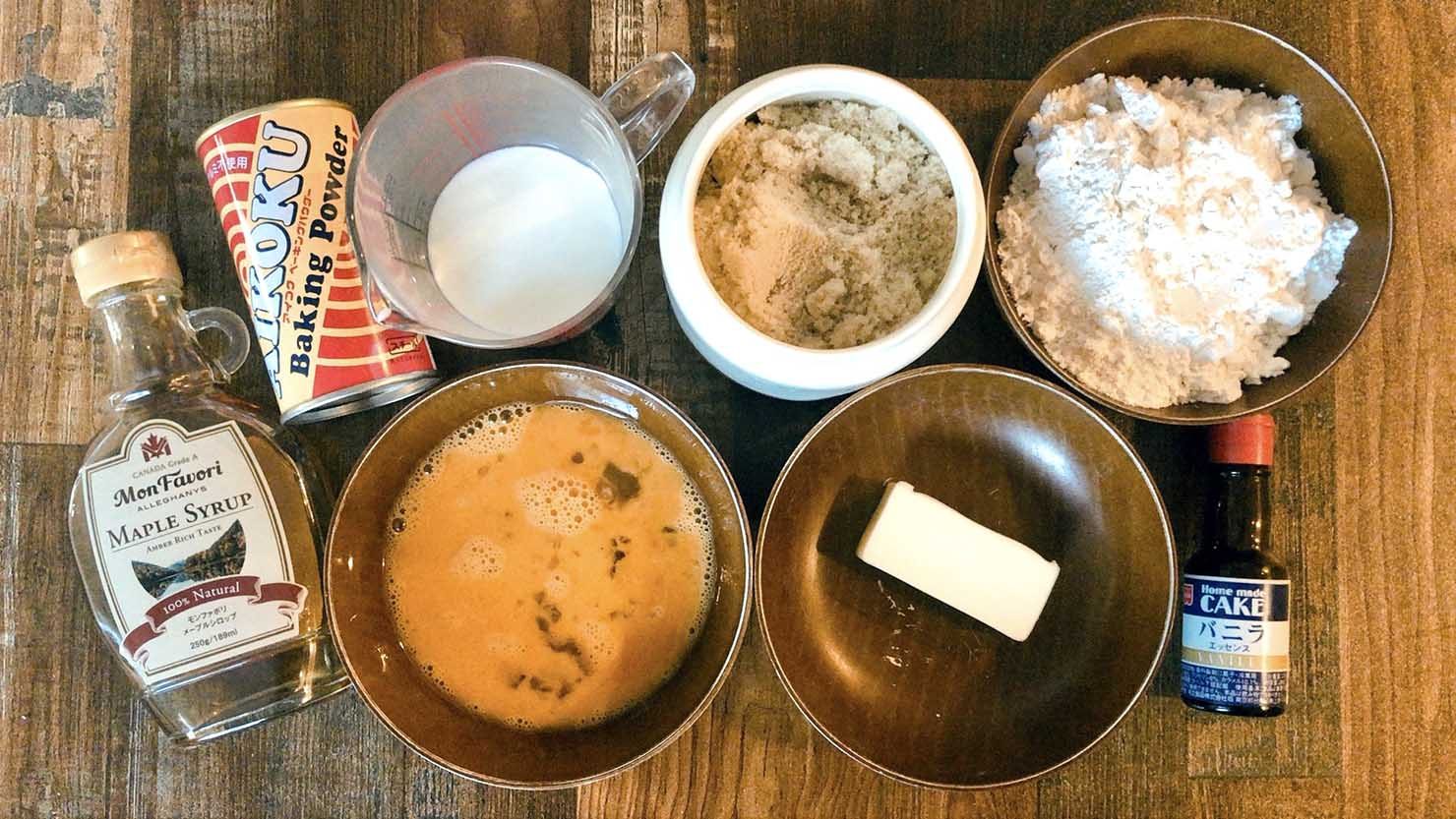 次のレシピでは、小麦粉とベーキングパウダーを使います。先ほどご紹介したホットケーキミックスを使ったものに比べると、ふっくらとした食感を楽しむことができますよ。