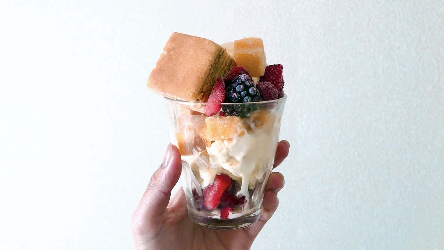 おうちで手作りバウムクーヘンができたらアレンジに挑戦してみましょう。アイスクリームとフルーツを飾ってパフェ風に仕上げるとリッチなデザートに仕上がります。
