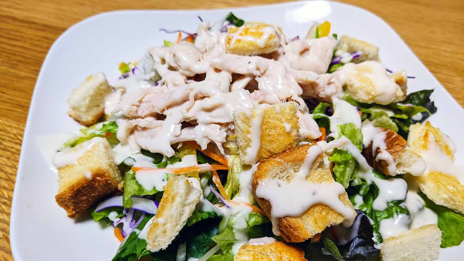 今回の写真ではシーザードレッシングを使っていますが、どのドレッシングでも代用できます。ドレッシングを変えて味のバリエーションを楽しんでみたり、自分好みの味を探してみたりするのもおすすめです。