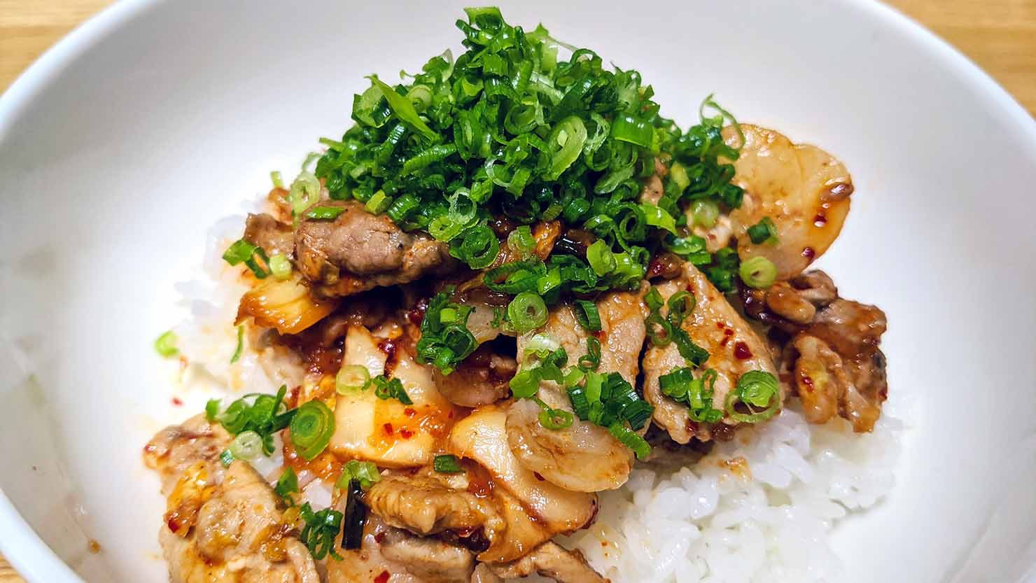 4. さっと炒めたら、どんぶりに盛ったごはんの上にのせて、ネギを散らしたら完成