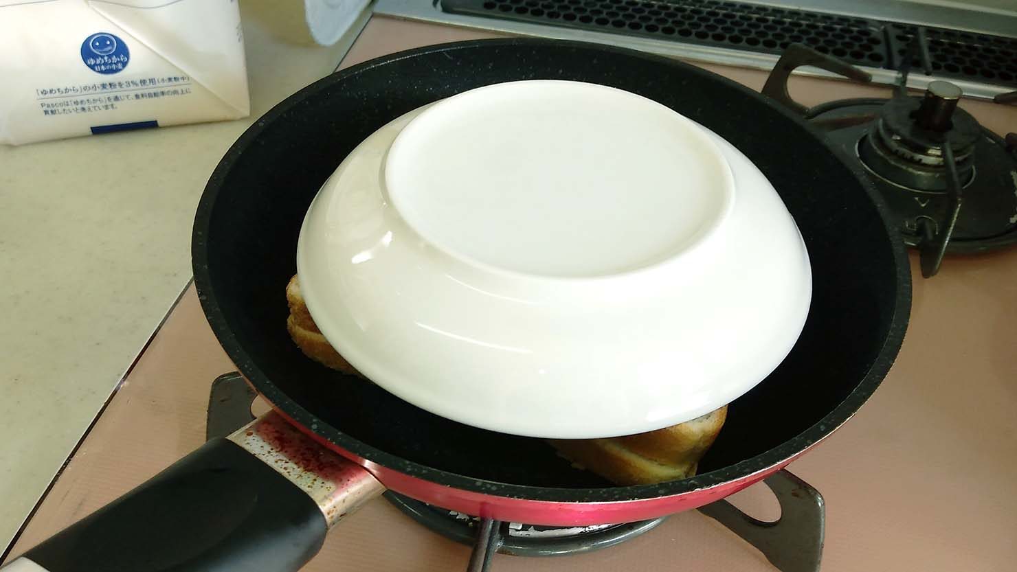 ⑤フライパンを弱火で熱し、具をはさんだ食パンに重しとしてお皿などをのせて焼いていきます