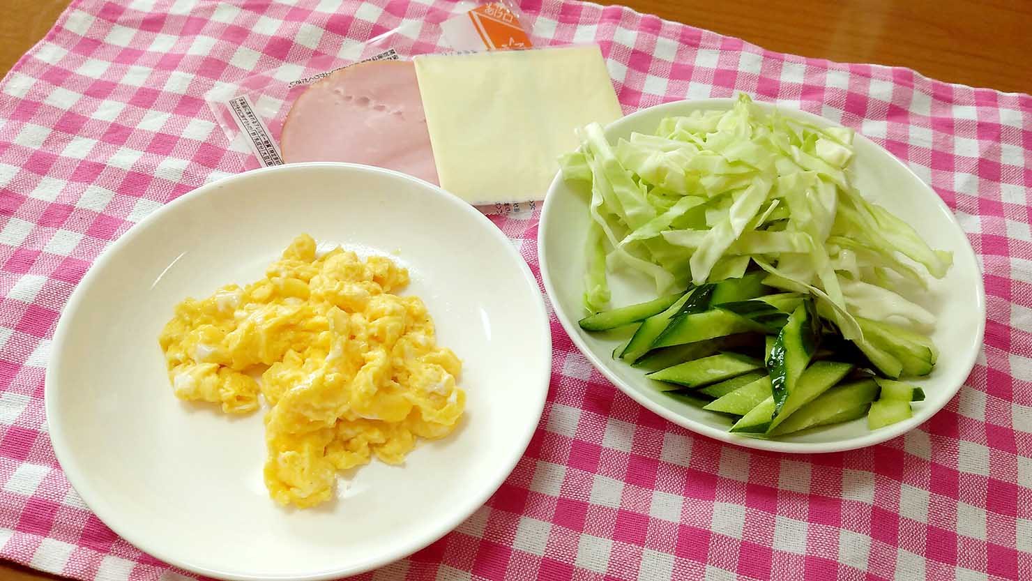 ④スライスチーズ→ロースハム→スクランブルエッグ→せん切り野菜の順にはさむ
