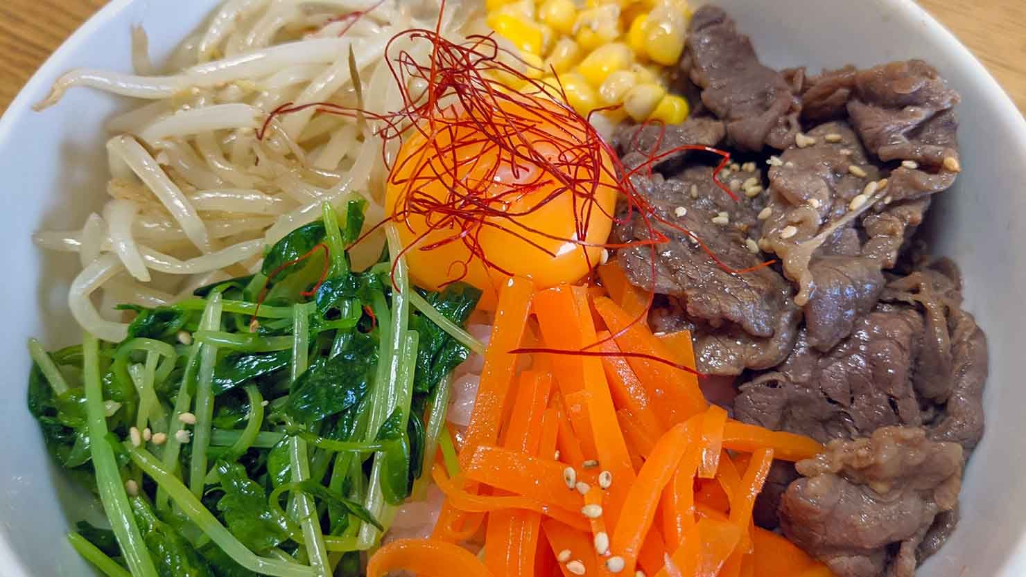 こちらはナムルが余ってしまったときの使い切りレシピです。牛肉と冷蔵庫で余っているナムルを、ごはんの上に載せれば完成するので手軽に作れます。